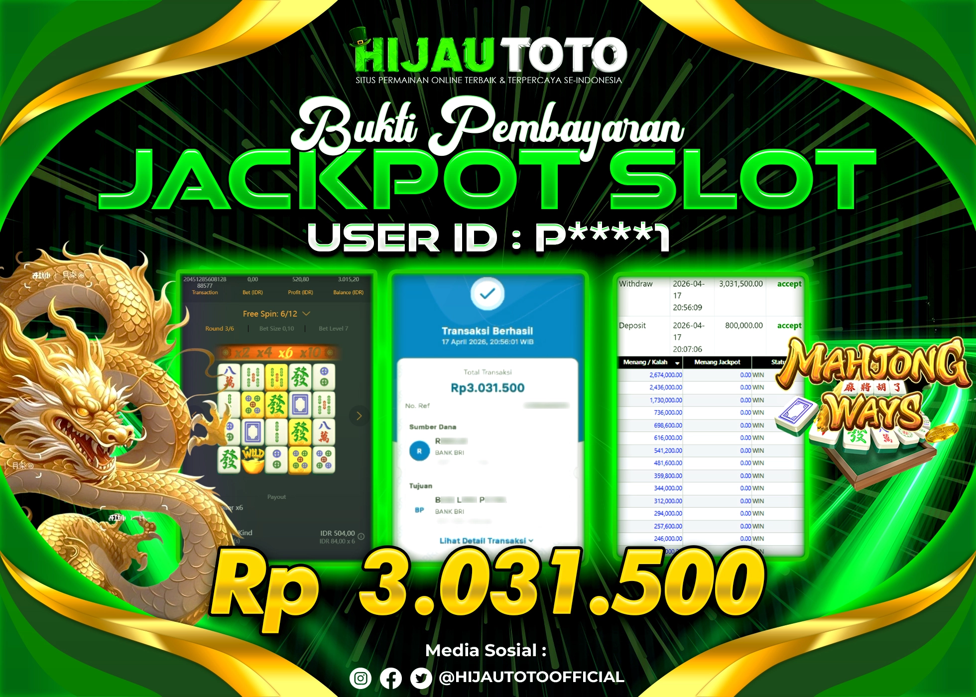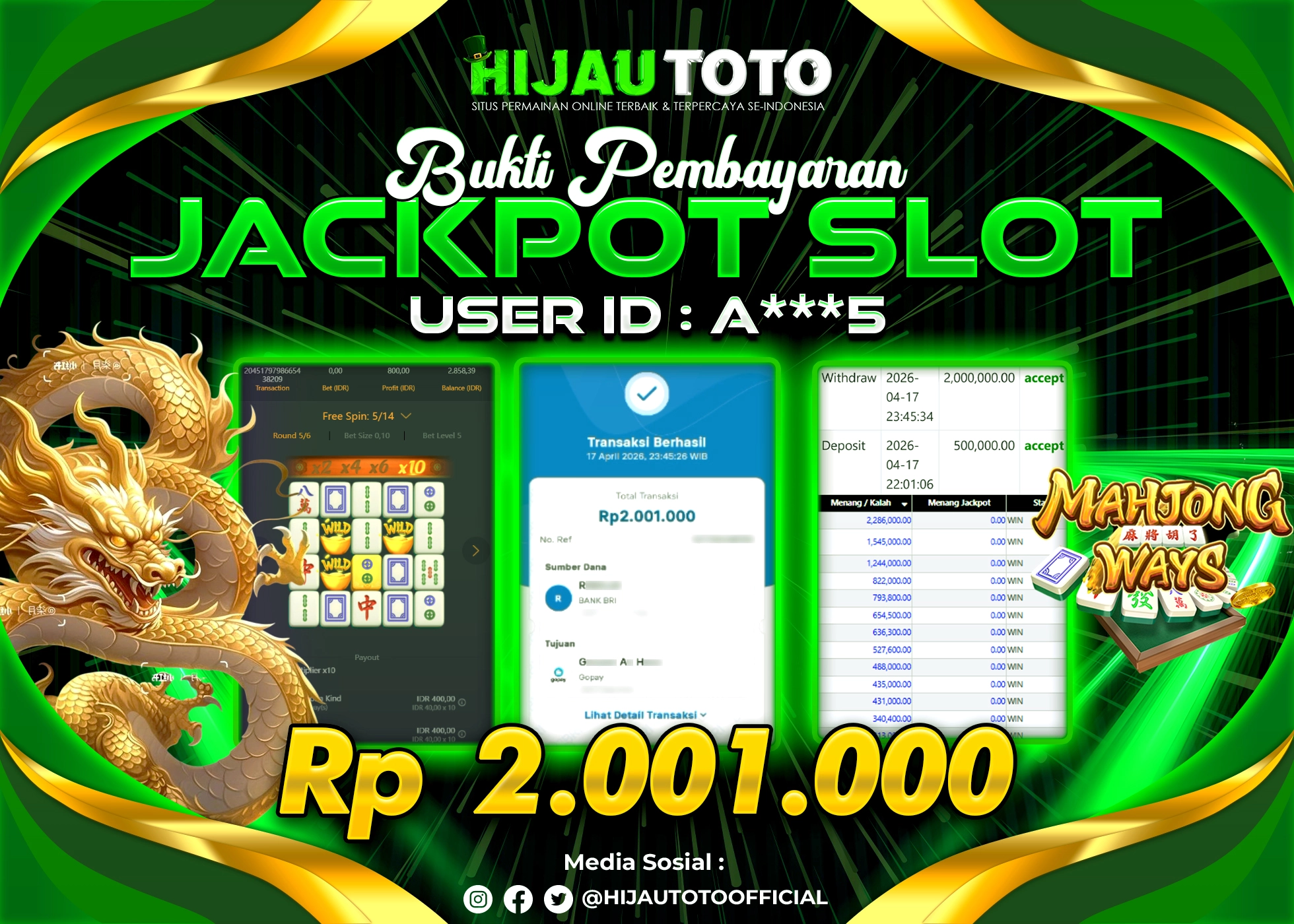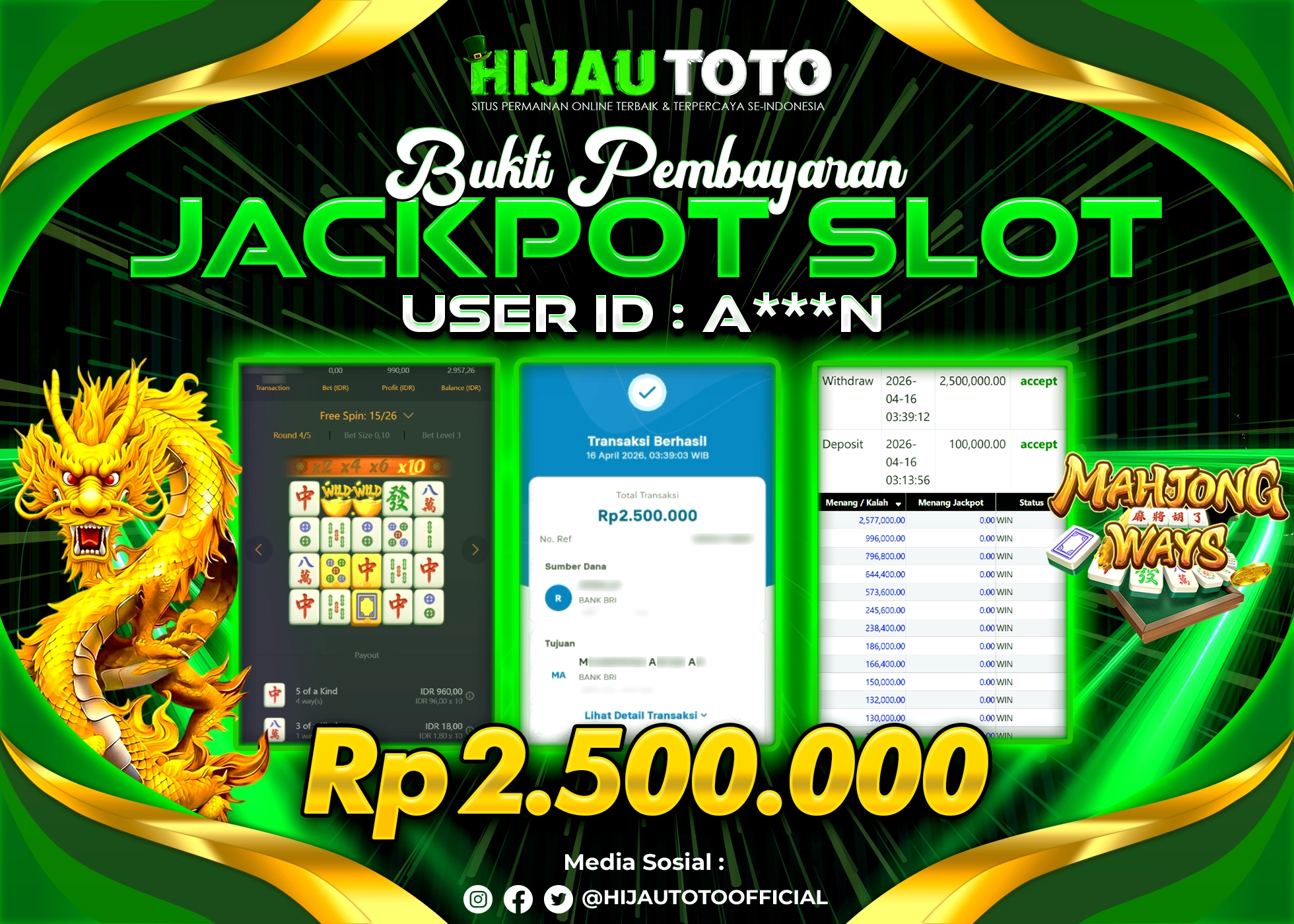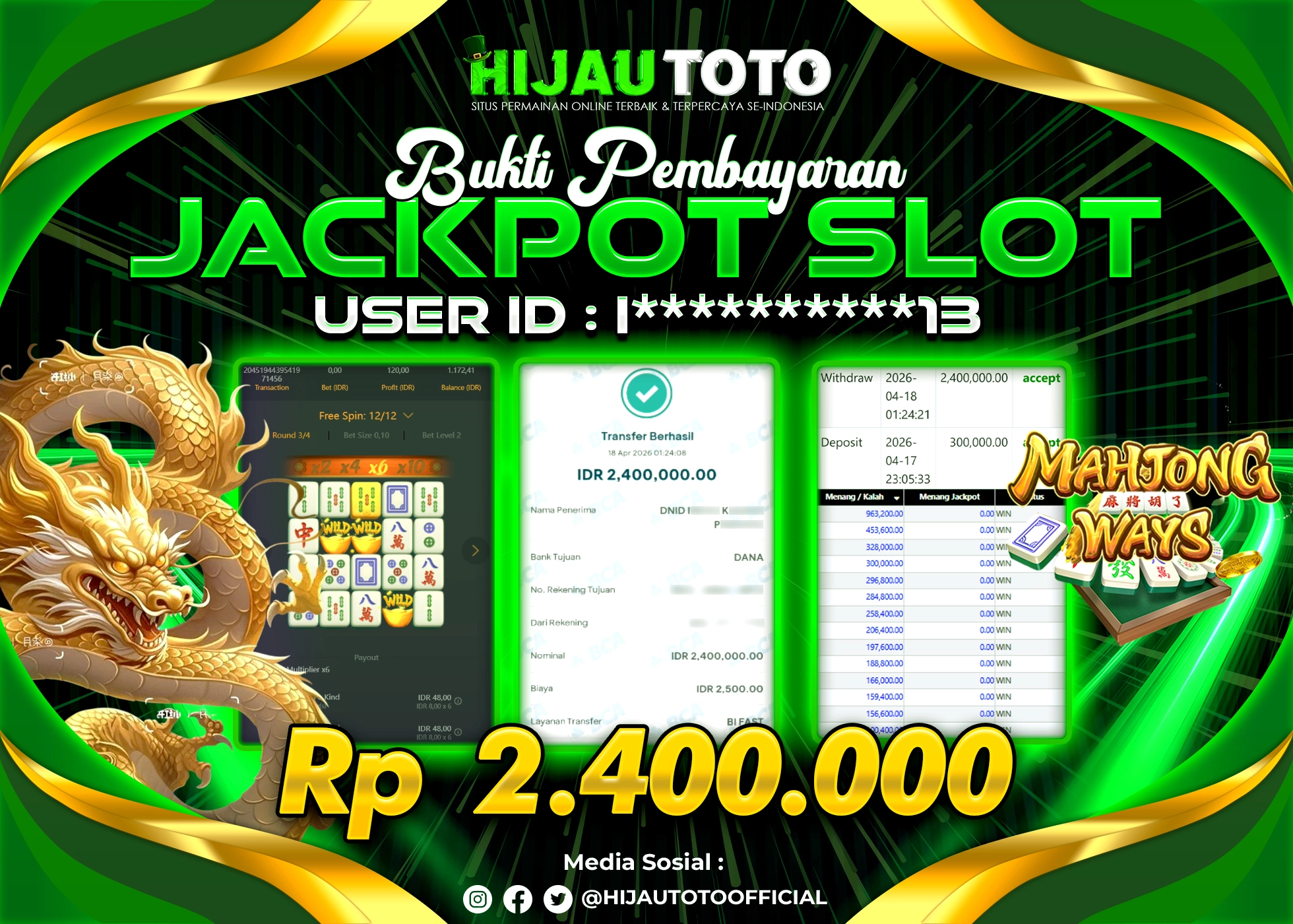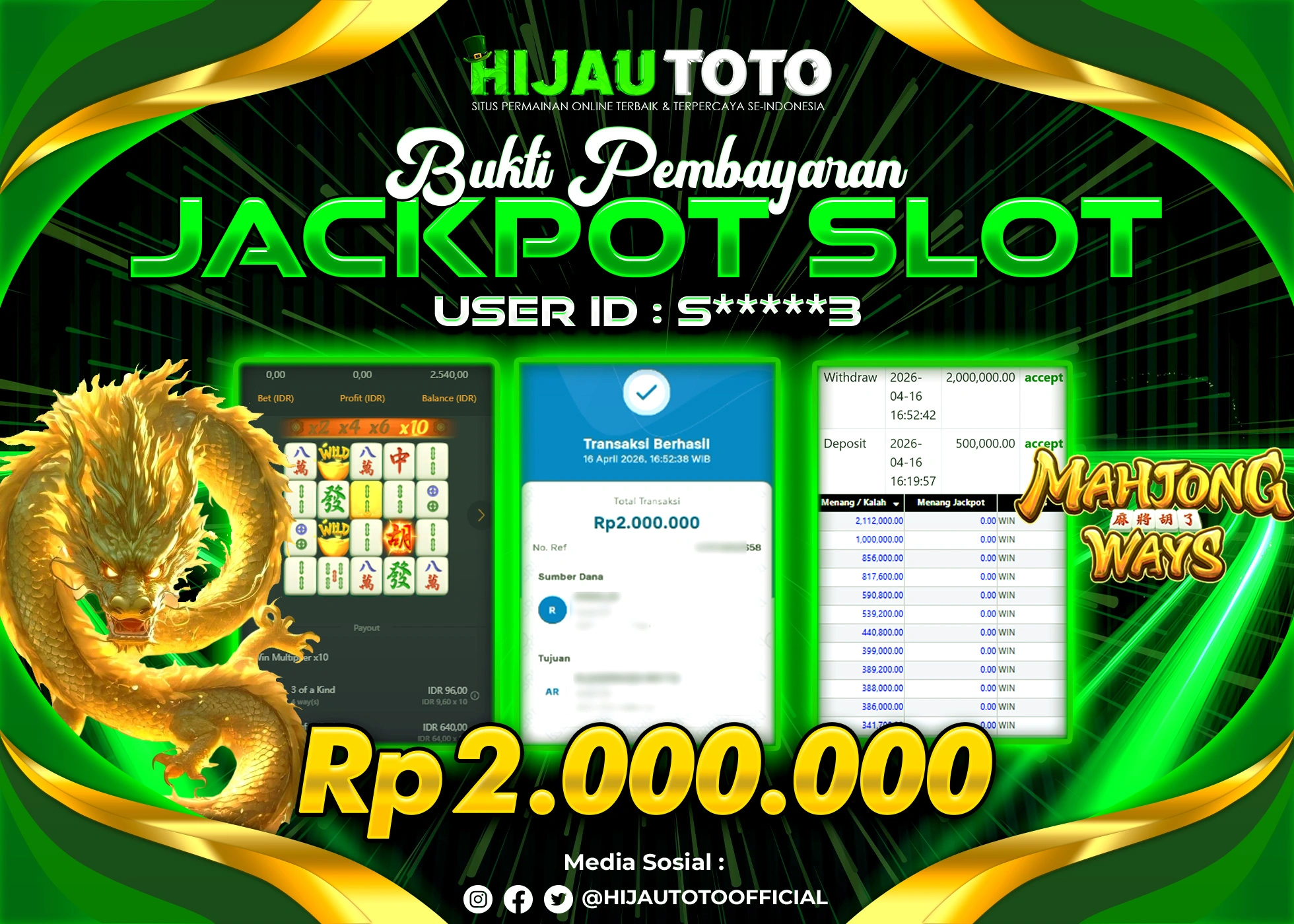 Selamat Kepada Member HIJAUTOTO I**********13 Telah Jackpot Di SLOT MAHJONG WAYS
