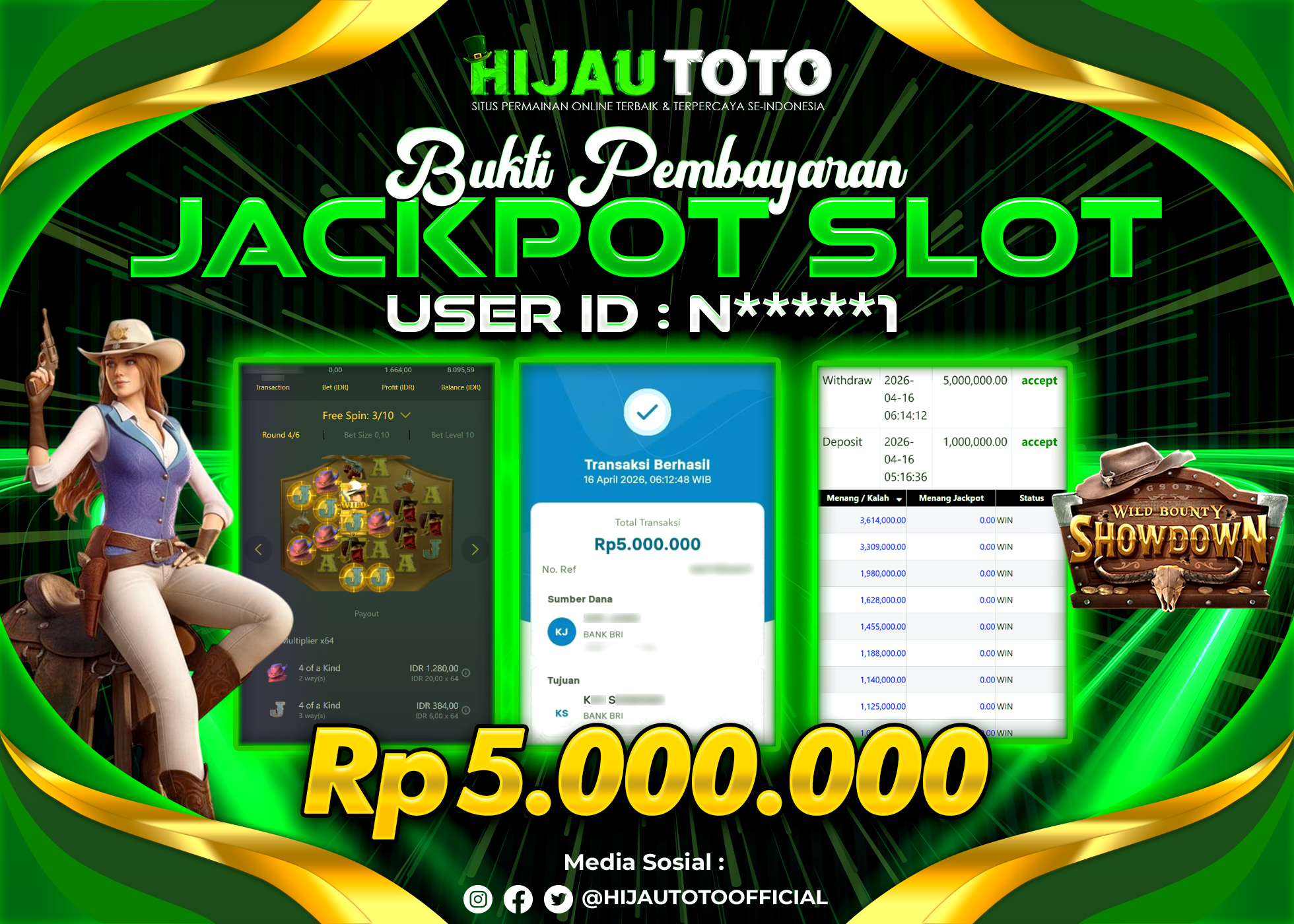 Selamat Kepada Member HIJAUTOTO N*****1 Telah Jackpot Di SLOT WILD BOUNTY SHOWDOWN