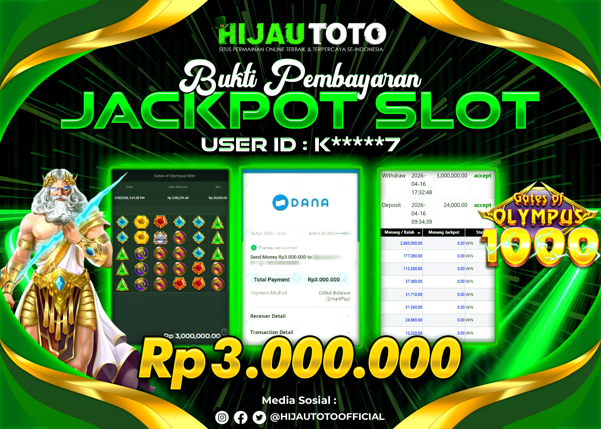 Selamat Kepada Member HIJAUTOTO K*****7 Telah Jackpot Di SLOT GATES OF OLYMPUS 1000