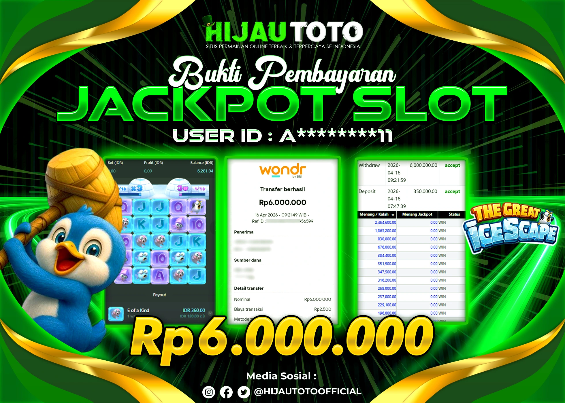 Selamat Kepada Member HIJAUTOTO A********11 Telah Jackpot Di SLOT THE GREAT ICESCAPE