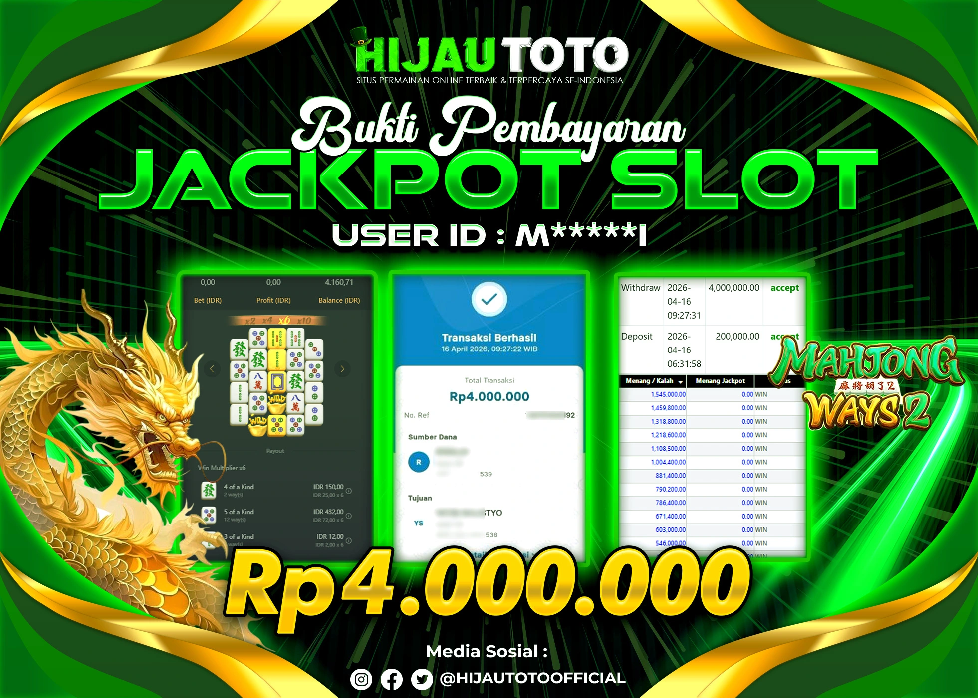 Selamat Kepada Member HIJAUTOTO A****N Telah Jackpot Di SLOT MAHJONG WAYS