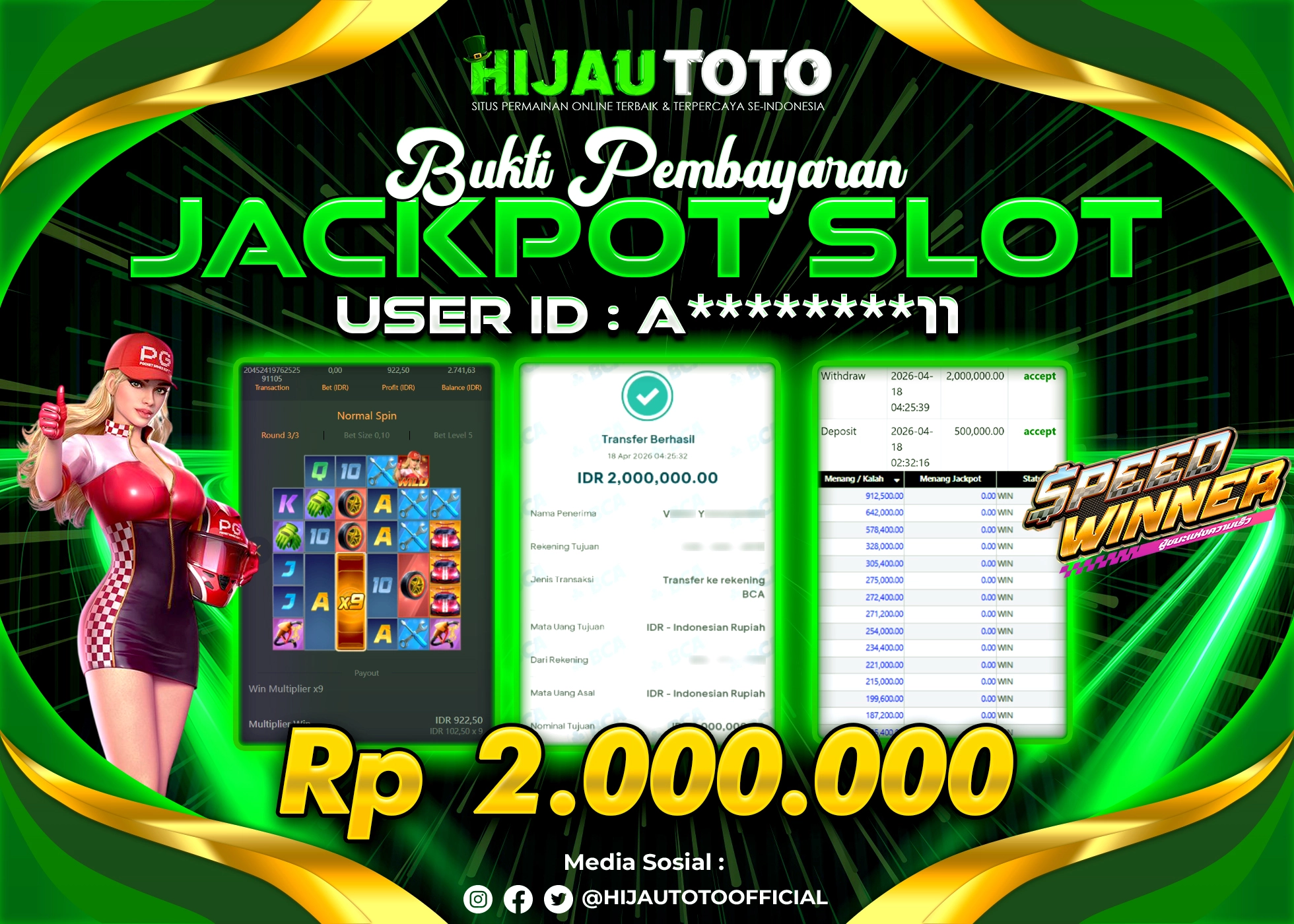 Selamat Kepada Member HIJAUTOTO A********11 Telah Jackpot Di SLOT SPEED WINNER