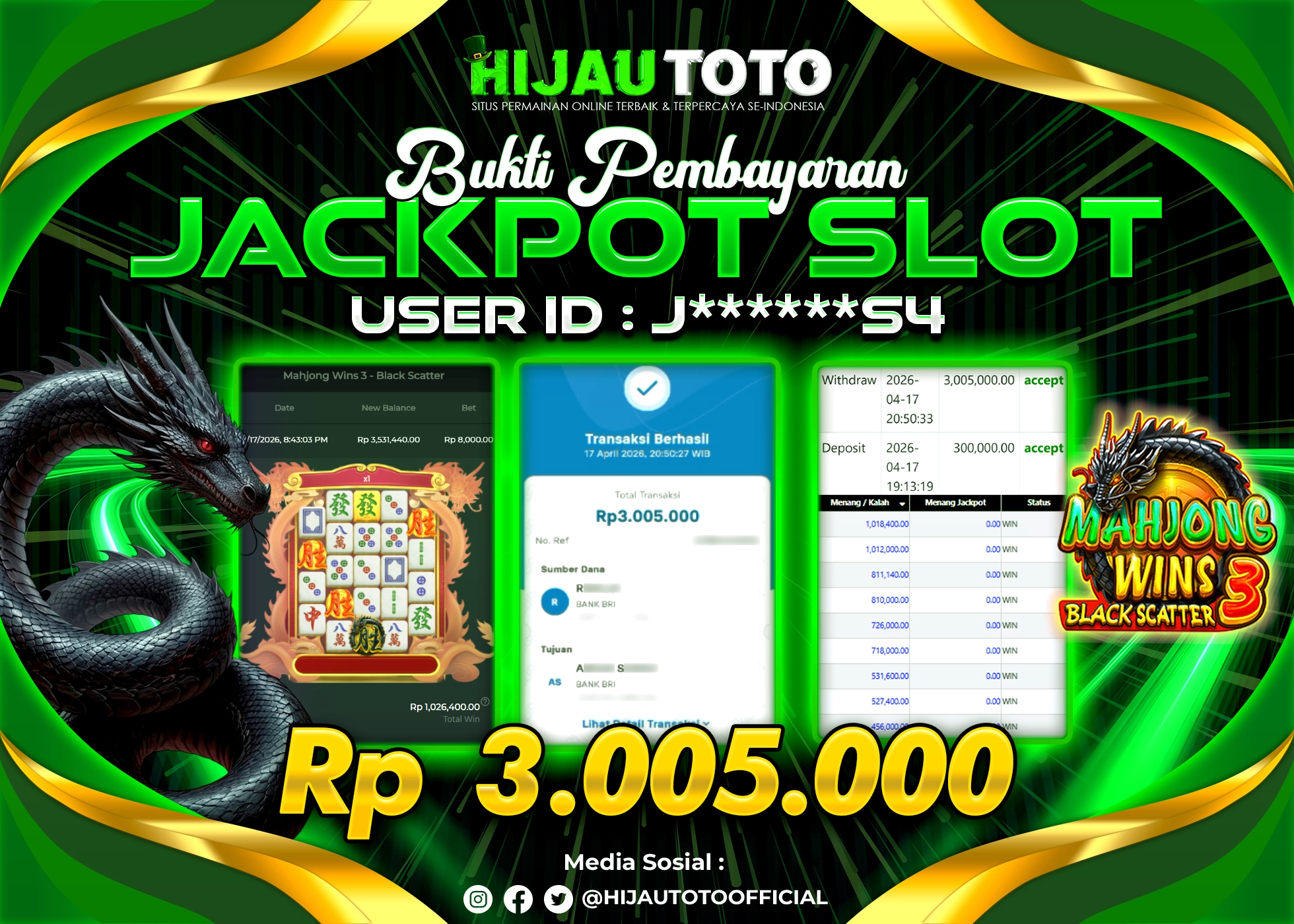 Selamat Kepada Member HIJAUTOTO J******S4 Telah Jackpot Di SLOT MAHJONG WINS 3 BLACK SCATTER