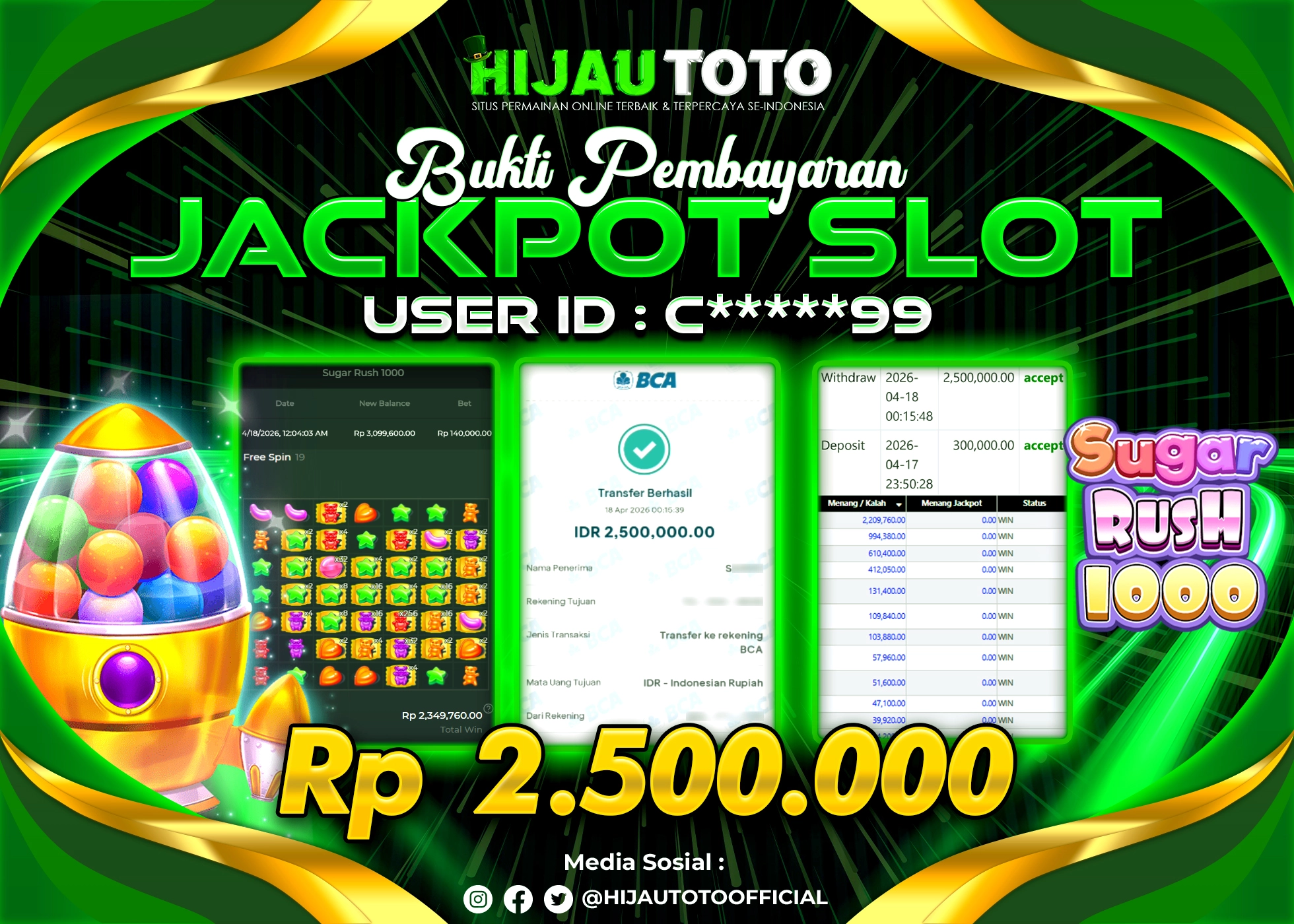 Selamat Kepada Member HIJAUTOTO C*****99 Telah Jackpot Di SLOT SUGAR RUSH 1000