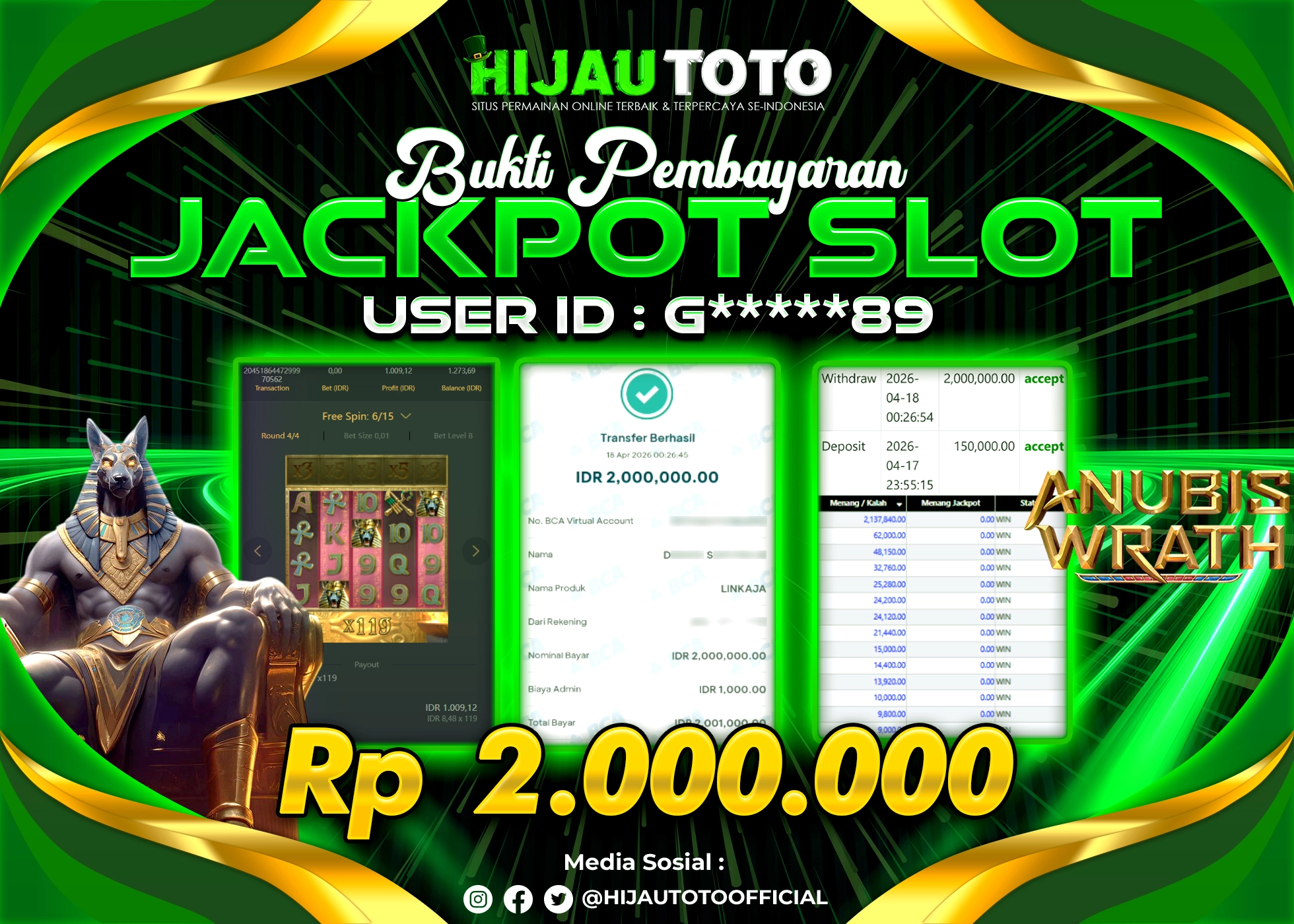 Selamat Kepada Member HIJAUTOTO G*****89 Telah Jackpot Di SLOT ANUBIS WRATH