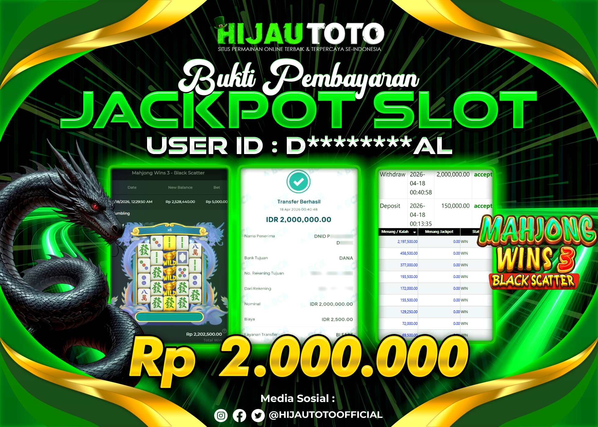 Selamat Kepada Member HIJAUTOTO D********AL Telah Jackpot Di SLOT MAHJONG WINS 3 BLACK SCATTER