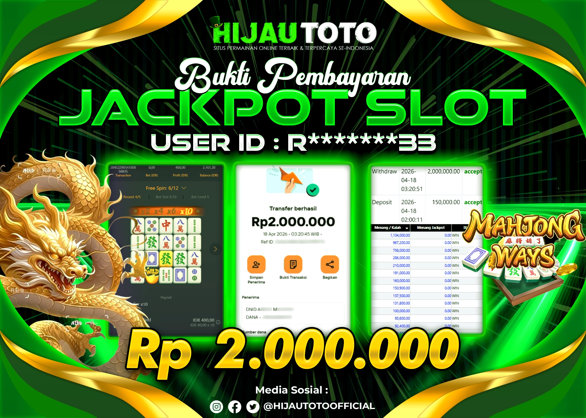 Selamat Kepada Member HIJAUTOTO R*******33 Telah Jackpot Di SLOT MAHJONG WAYS