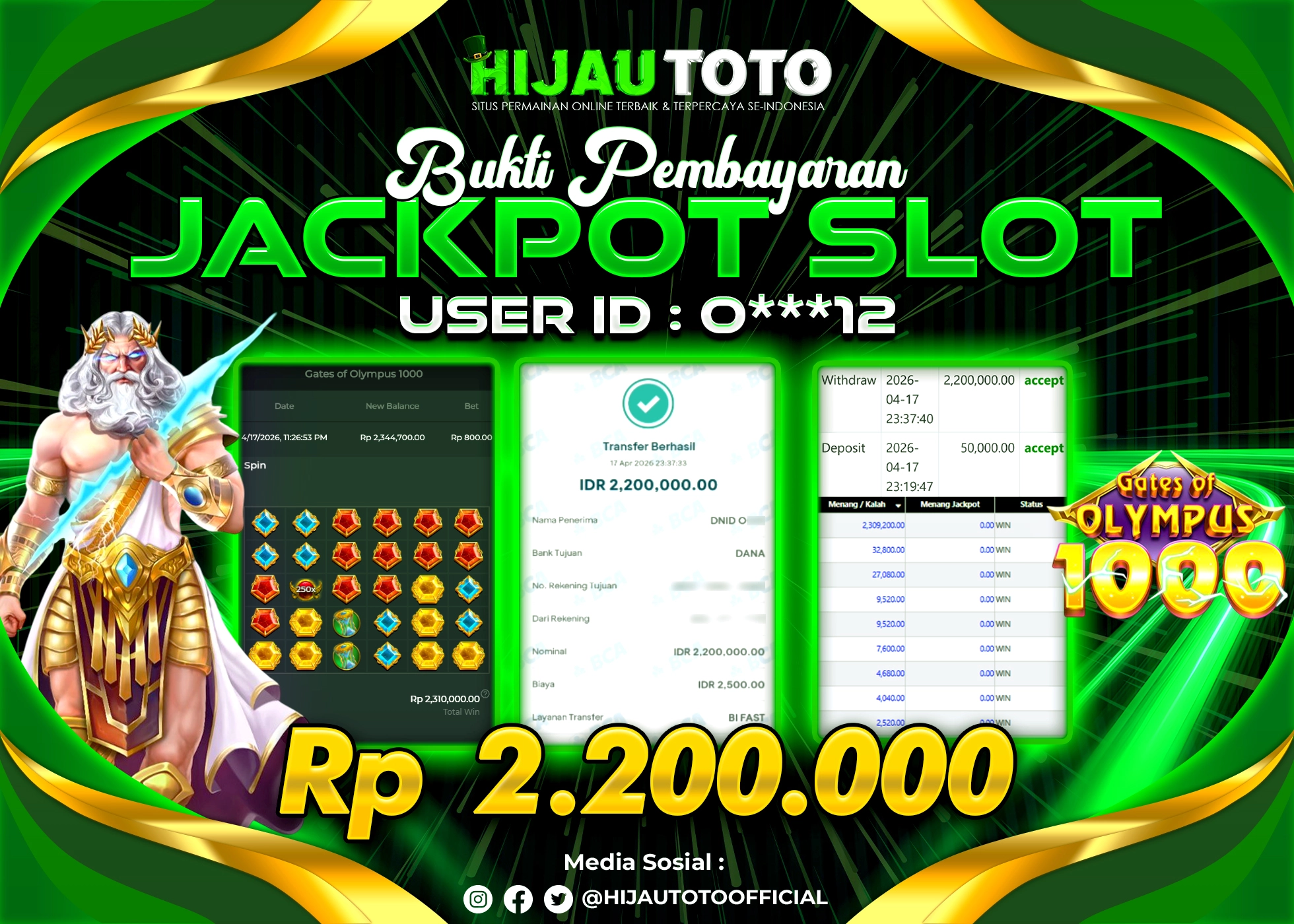 Selamat Kepada Member HIJAUTOTO O****2 Telah Jackpot Di SLOT GATES OF OLYMPUS 1000