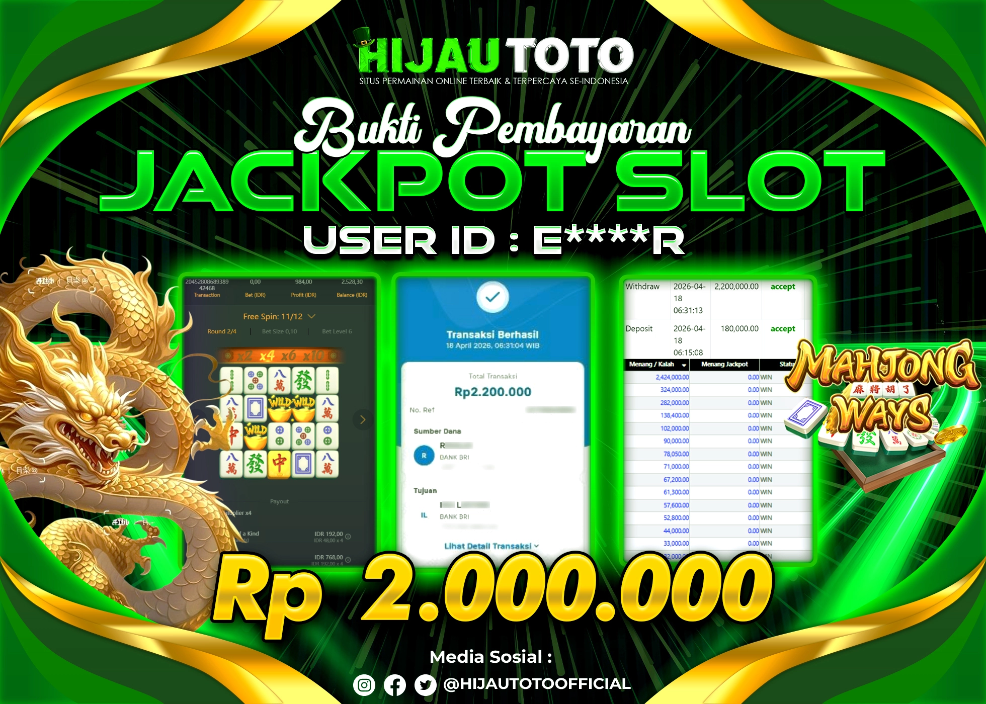 Selamat Kepada Member HIJAUTOTO E****R Telah Jackpot Di SLOT MAHJONG WAYS