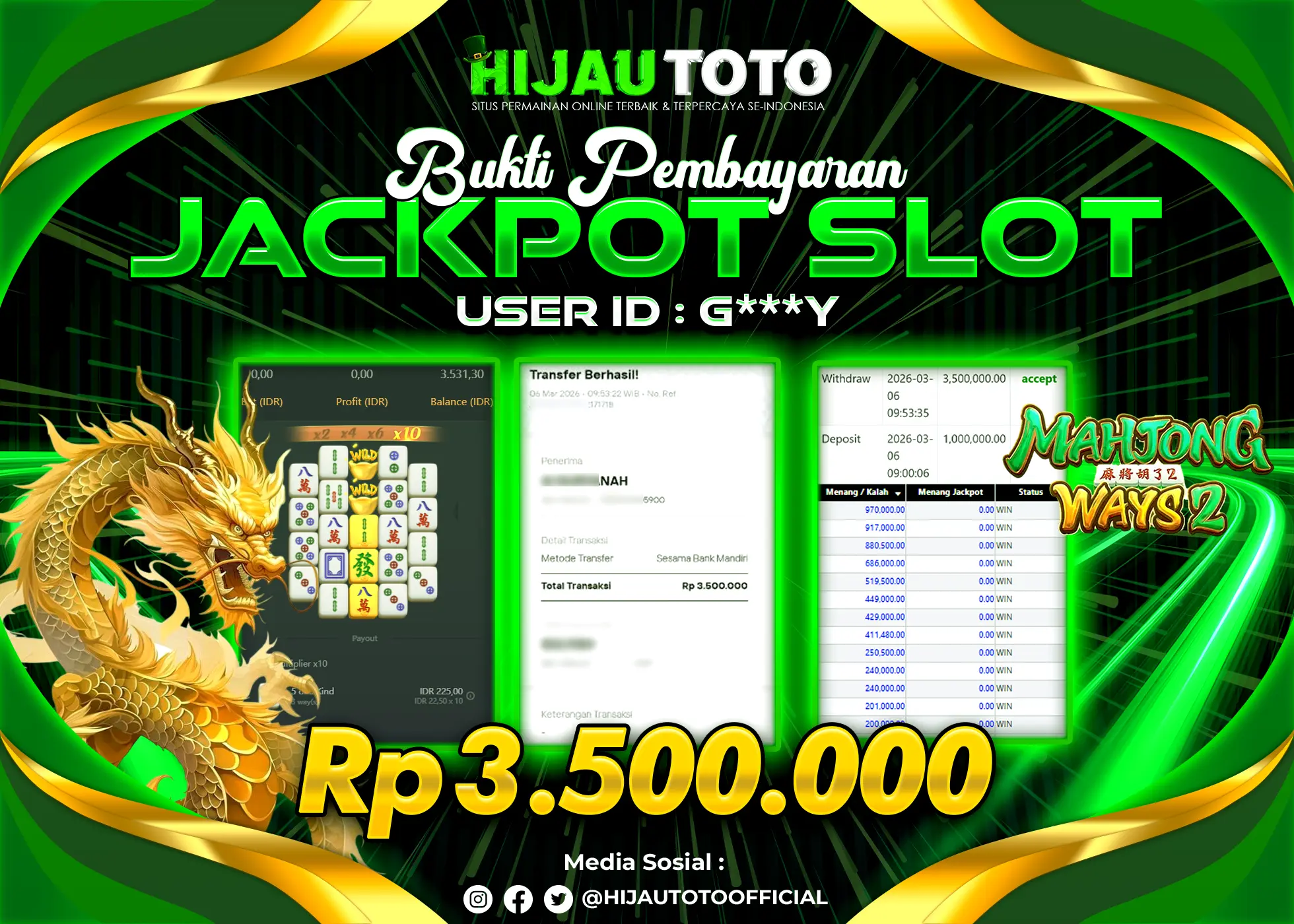 Bergabung dengan HIJAUTOTO sangat mudah dan cepat. Cukup lakukan pendaftaran dengan data lengkap, lakukan deposit minimal Rp5.000 melalui berbagai metode termasuk QRIS, dan mulai bertaruh dengan minimal taruhan Rp100. Dapatkan juga bonus new member 100% untuk modal bermain lebih besar.