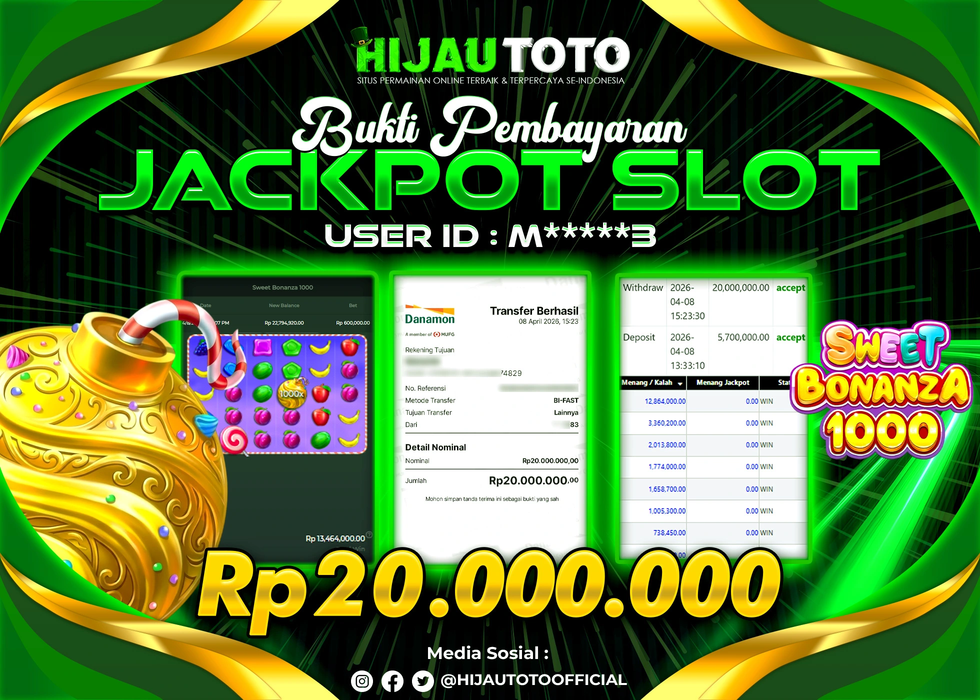Selamat Kepada Member HIJAUTOTO M*****3 Telah Jackpot Di SLOT SWEET BONANZA 1000