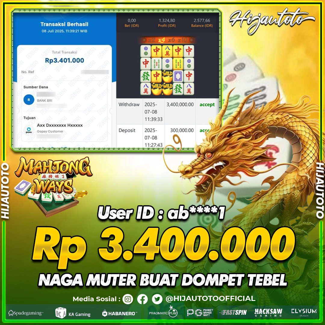Selamat Kepada Member HIJAUTOTO AB****1 Telah Jackpot Di SLOT MAHJONG WAYS