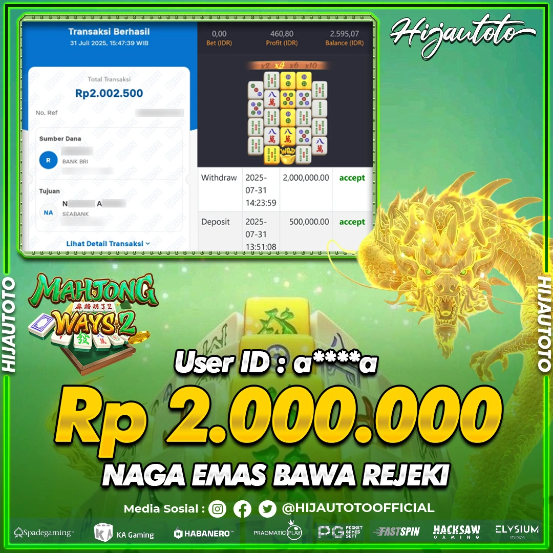 Karena berhasil memenangkan Rp.Rp.2.600.000 dari permainan seru SLOT MAHJONG WAYS di HIJAUTOTO! πŸ’°πŸ’Έ
