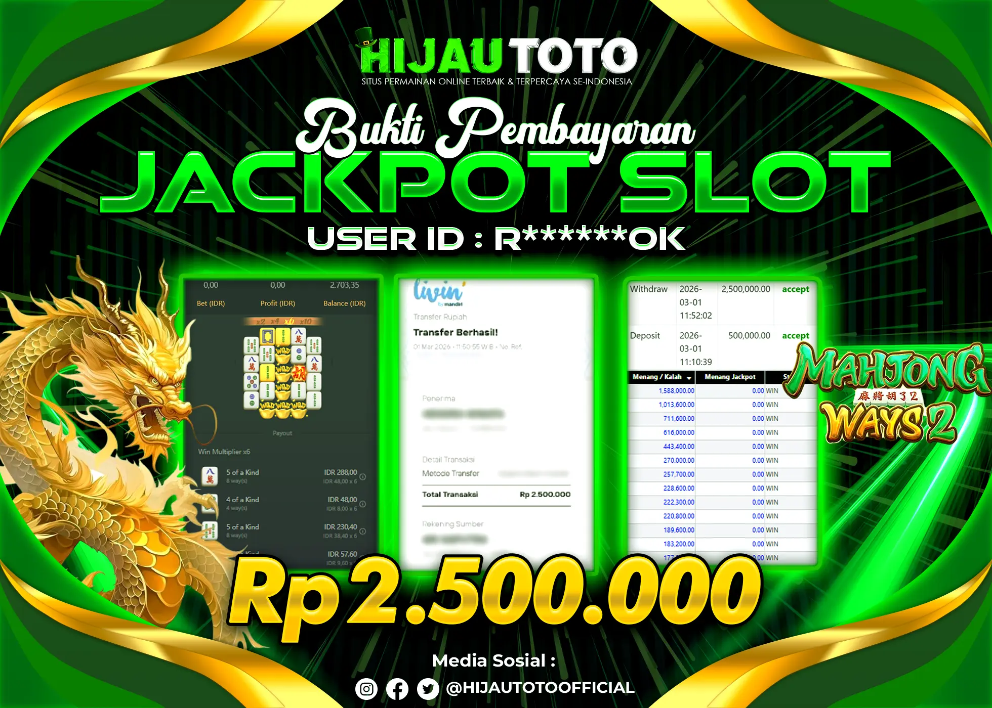 Selamat Kepada Member HIJAUTOTO R******OK Telah Jackpot Di SLOT MAHJONG WAYS 2