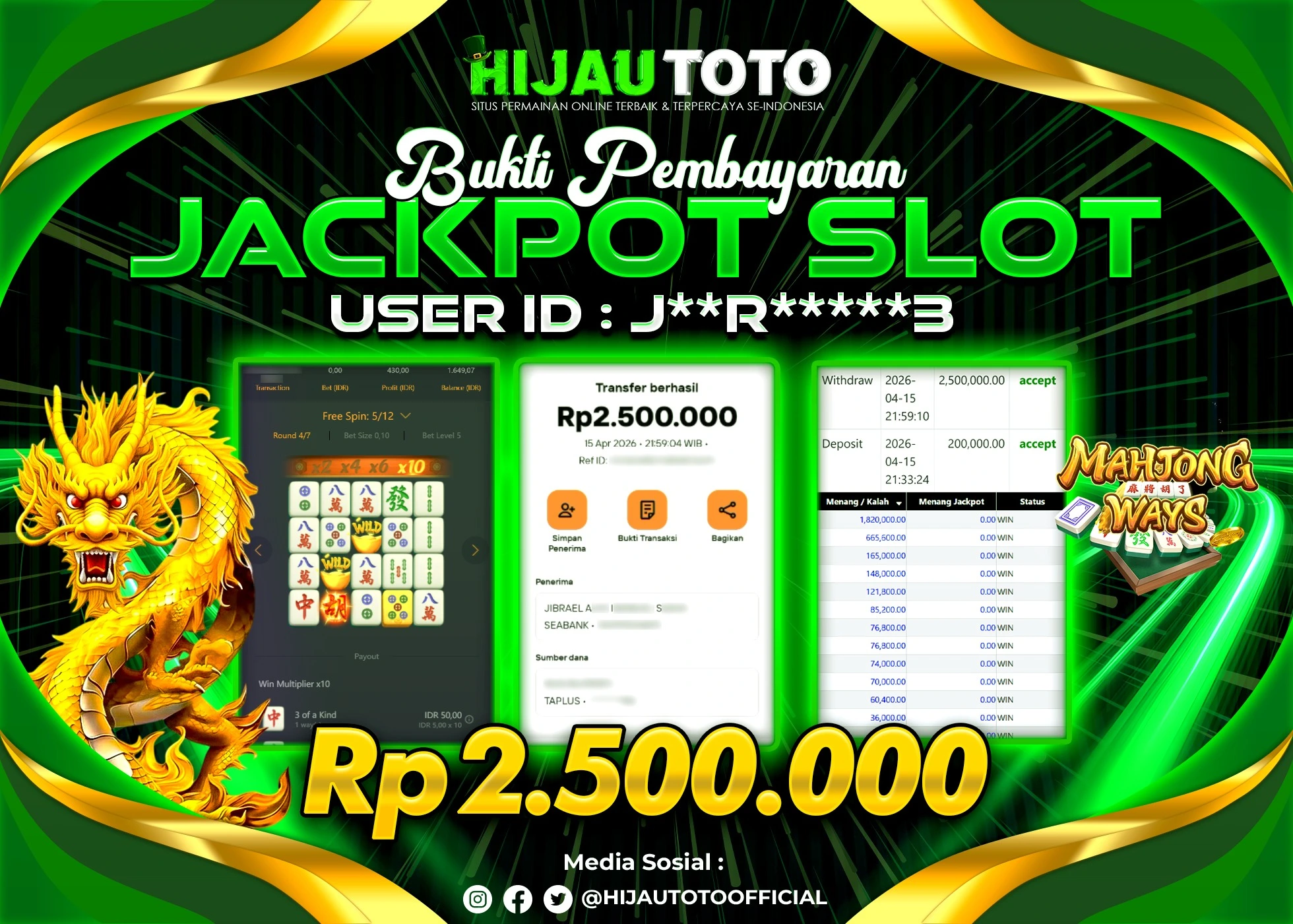 Selamat Kepada Member HIJAUTOTO J**R*****3 Telah Jackpot Di SLOT MAHJONG WAYS