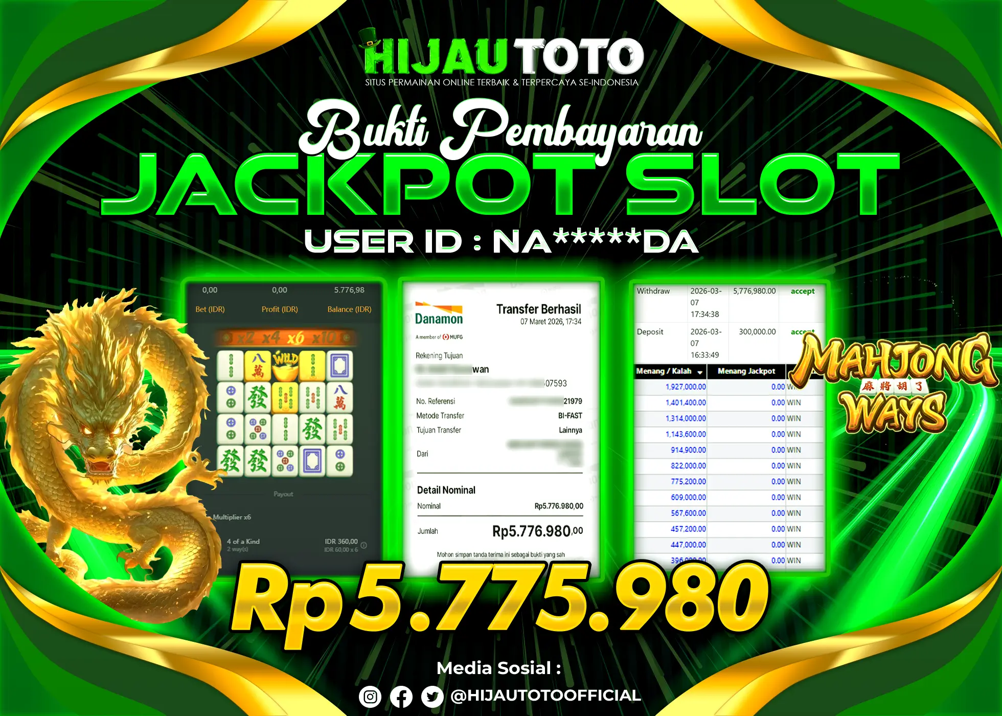 Selamat Kepada Member HIJAUTOTO NA*****DA Telah Jackpot Di SLOT MAHJONG WAYS