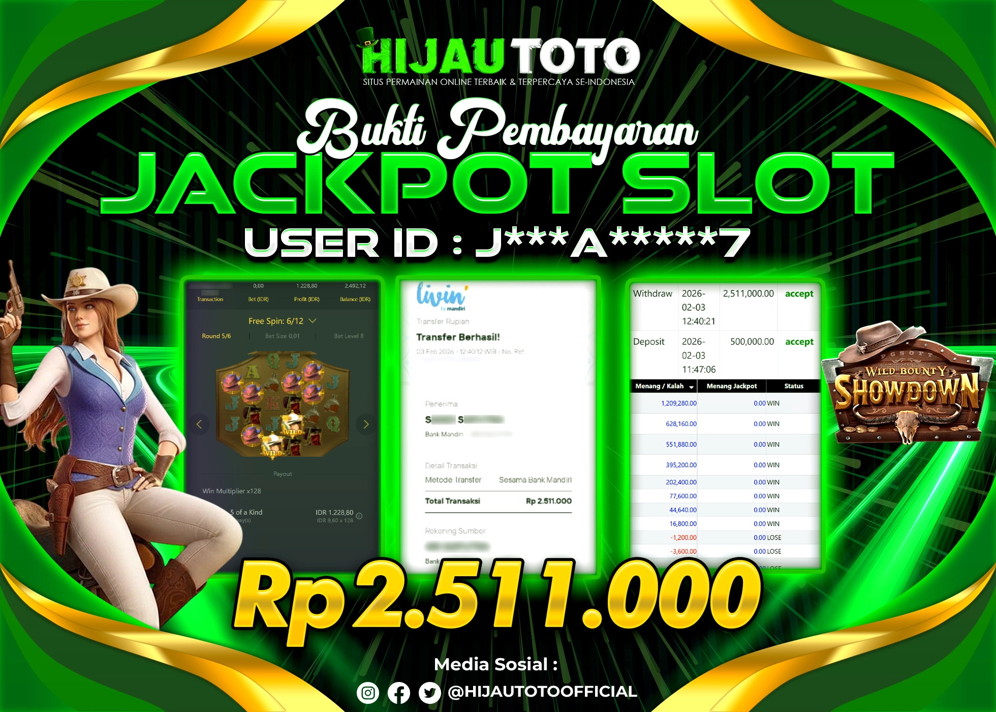 Selamat Kepada Member HIJAUTOTO J***A*****7 Telah Jackpot Di SLOT WILD BOUNTY SHOWDOWN