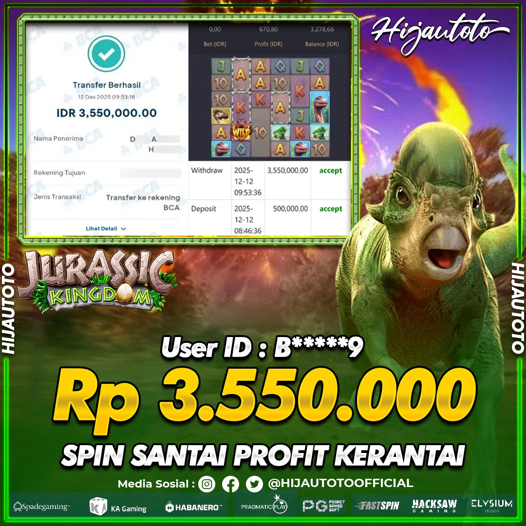 Selamat Kepada Member HIJAUTOTO B*****9 Telah Jackpot Di SLOT JURASSIC KINGDOM