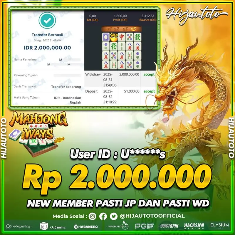 Selamat Kepada Member HIJAUTOTO U******S Telah Jackpot Di SLOT MAHJONG WAYS