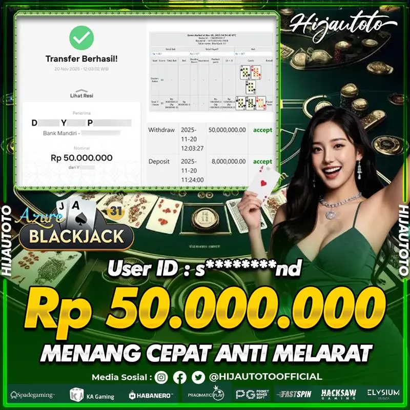 Selamat Kepada Member HIJAUTOTO S*******ND Telah Jackpot Di SLOT AZURE BLACKJACK 31