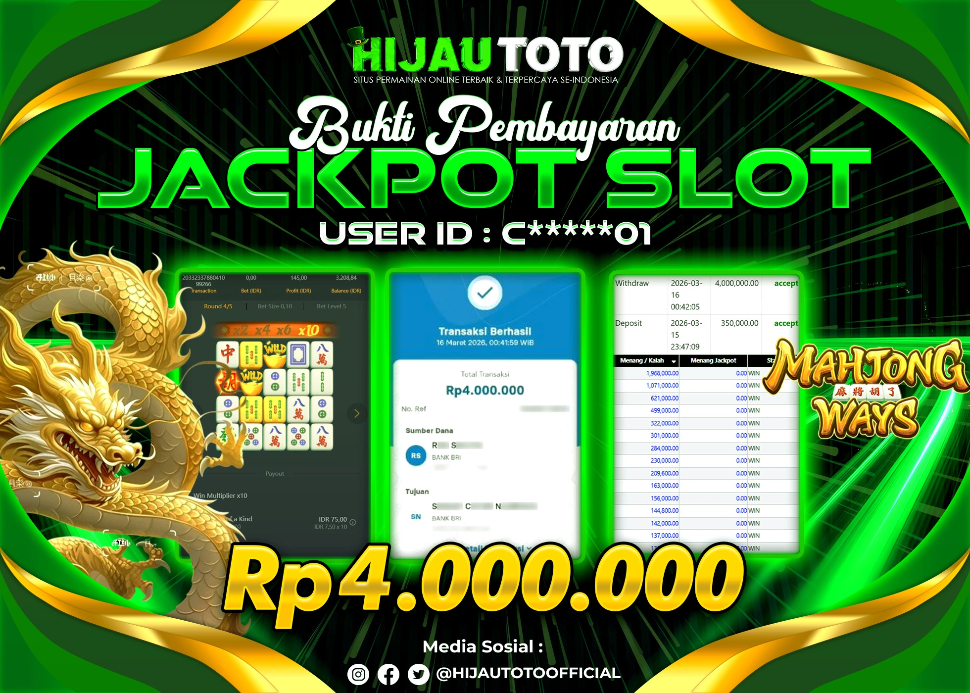 Selamat Kepada Member HIJAUTOTO C*****01 Telah Jackpot Di SLOT MAHJONG WAYS