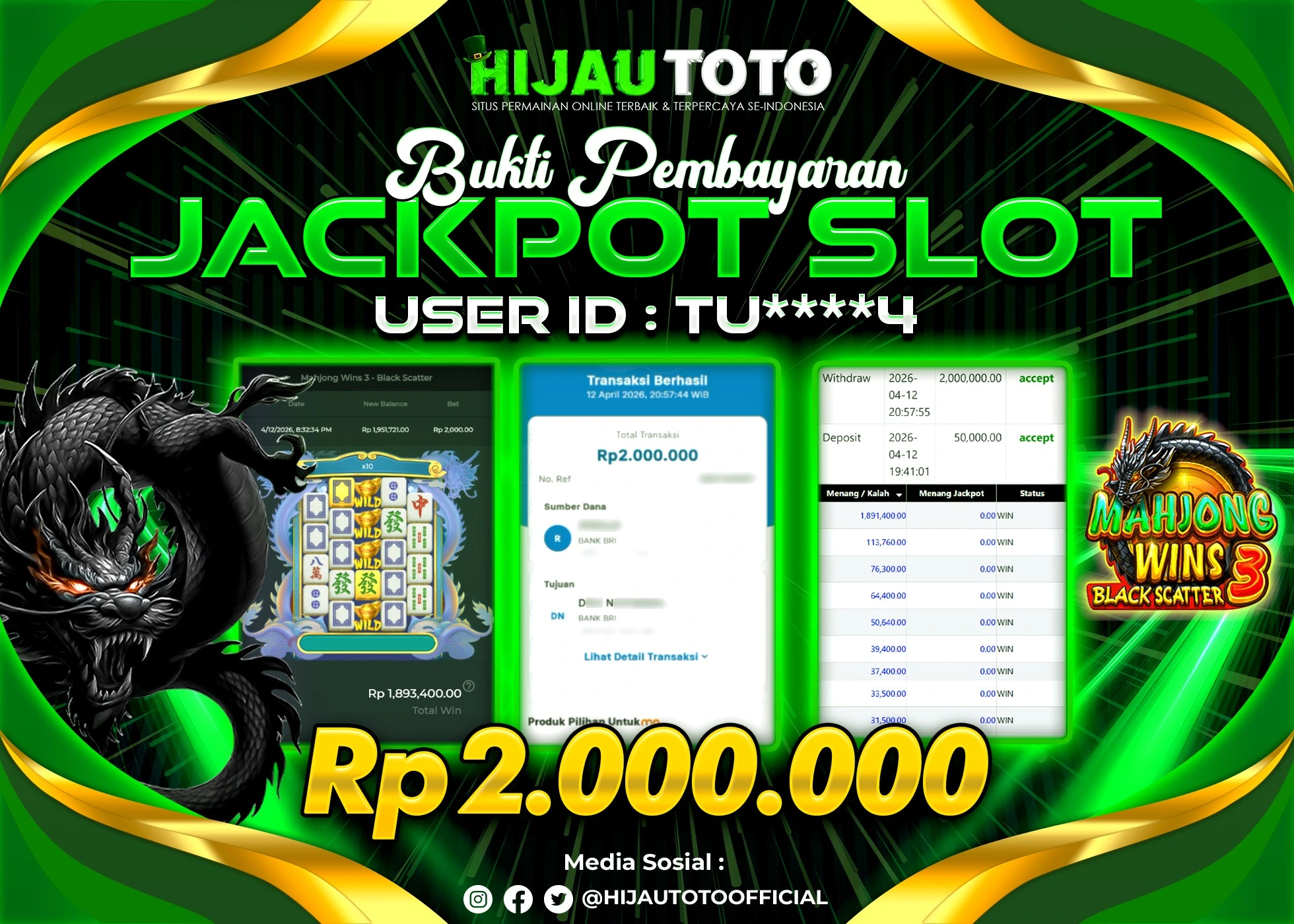 Selamat Kepada Member HIJAUTOTO TU****4 Telah Jackpot Di SLOT MAHJONG WINS 3 BLACK SCATTER