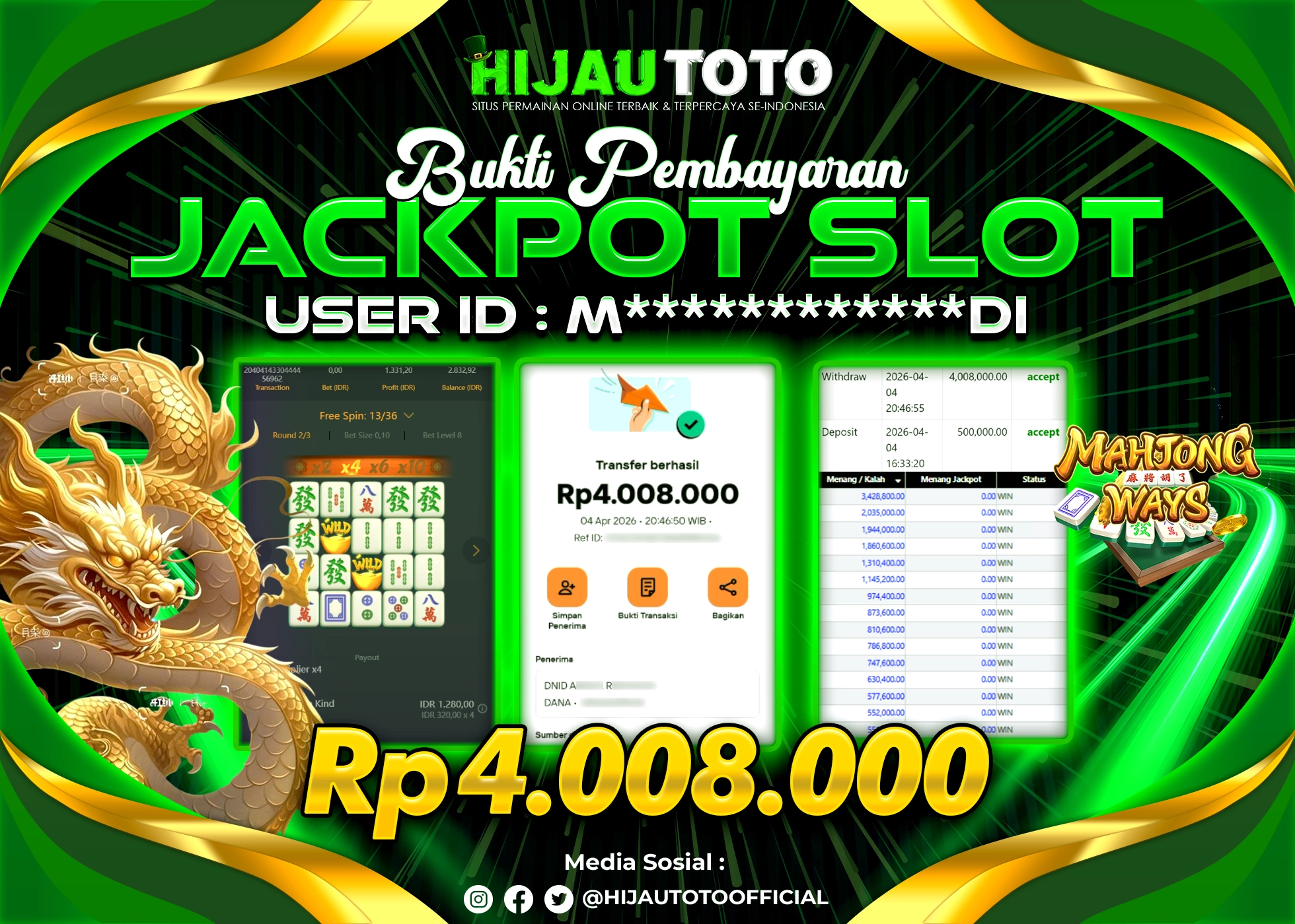 Bergabung dengan HIJAUTOTO sangat mudah dan cepat. Cukup lakukan pendaftaran dengan data lengkap, lakukan deposit minimal Rp5.000 melalui berbagai metode termasuk QRIS, dan mulai bertaruh dengan minimal taruhan Rp100. Dapatkan juga bonus new member 100% untuk modal bermain lebih besar.