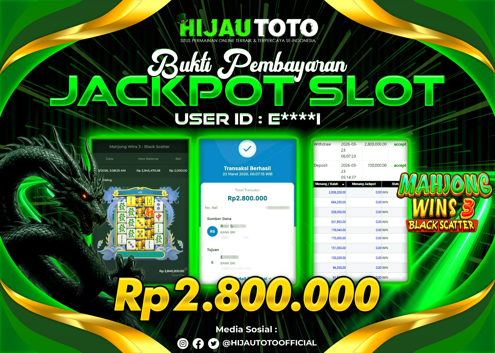 Selamat Kepada Member HIJAUTOTO E****I Telah Jackpot Di SLOT MAHJONG WINS 3 BLACK SCATTER