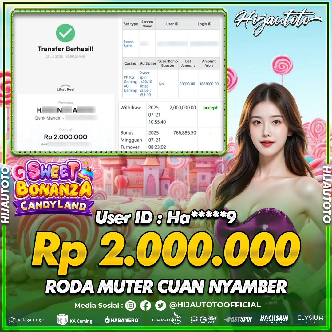 Selamat Kepada Member HIJAUTOTO HA*****9 Telah Jackpot Di LIVE CASINO SWEET BONANZA CANDYLAND