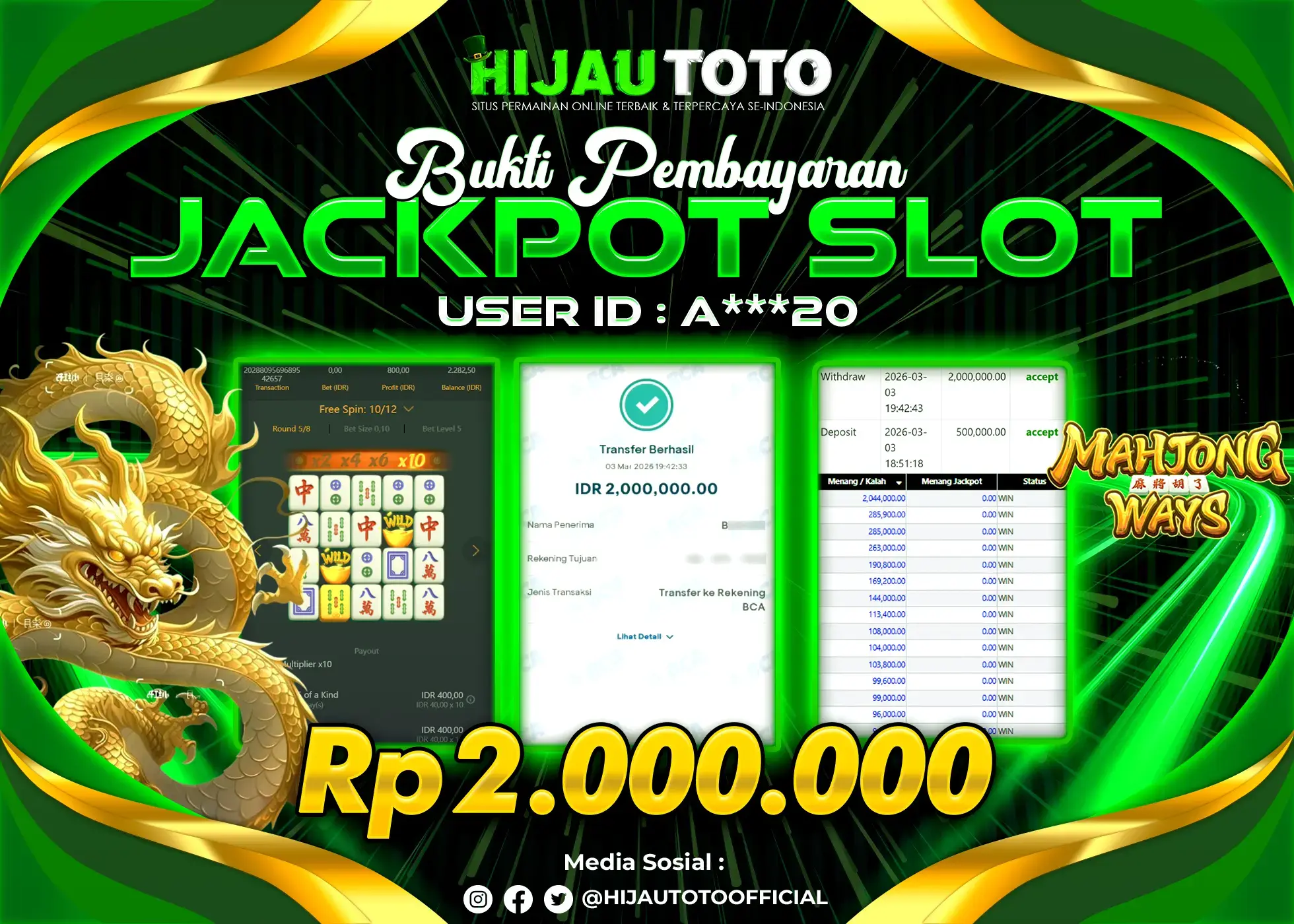 Selamat datang di HIJAUTOTO, tempatnya seru-seruan dan cuan besar! Mulai main cukup dengan modal Rp5.000 aja, taruhan super murah dari Rp100 perak! Mau main slot yang penuh warna? Atau togel dari 20 pasaran paling hits? Atau mungkin tembak ikan yang bikin deg-degan? Tenang, ada juga taruhan bola, sabung ayam, dan live casino yang bikin suasana makin hidup! Daftar sekarang dan dapetin bonus new member 100% langsung, biar modalmu makin tebal. Deposit gampang banget, bisa pakai QRIS, dan kalau butuh bantuan, customer service kita siap 24 jam nonstop. Jadi, tunggu apa lagi? Yuk, gabung dan bawa pulang kemenangannya cuma di HIJAUTOTO!