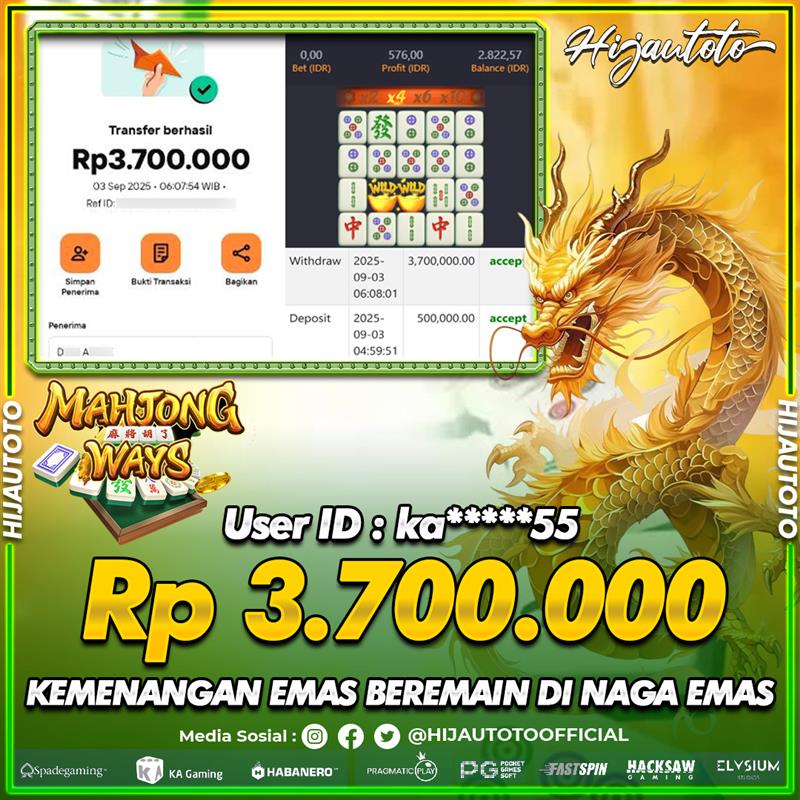 Selamat Kepada Member HIJAUTOTO KA*****55 Telah Jackpot Di SLOT MAHJONG WAYS