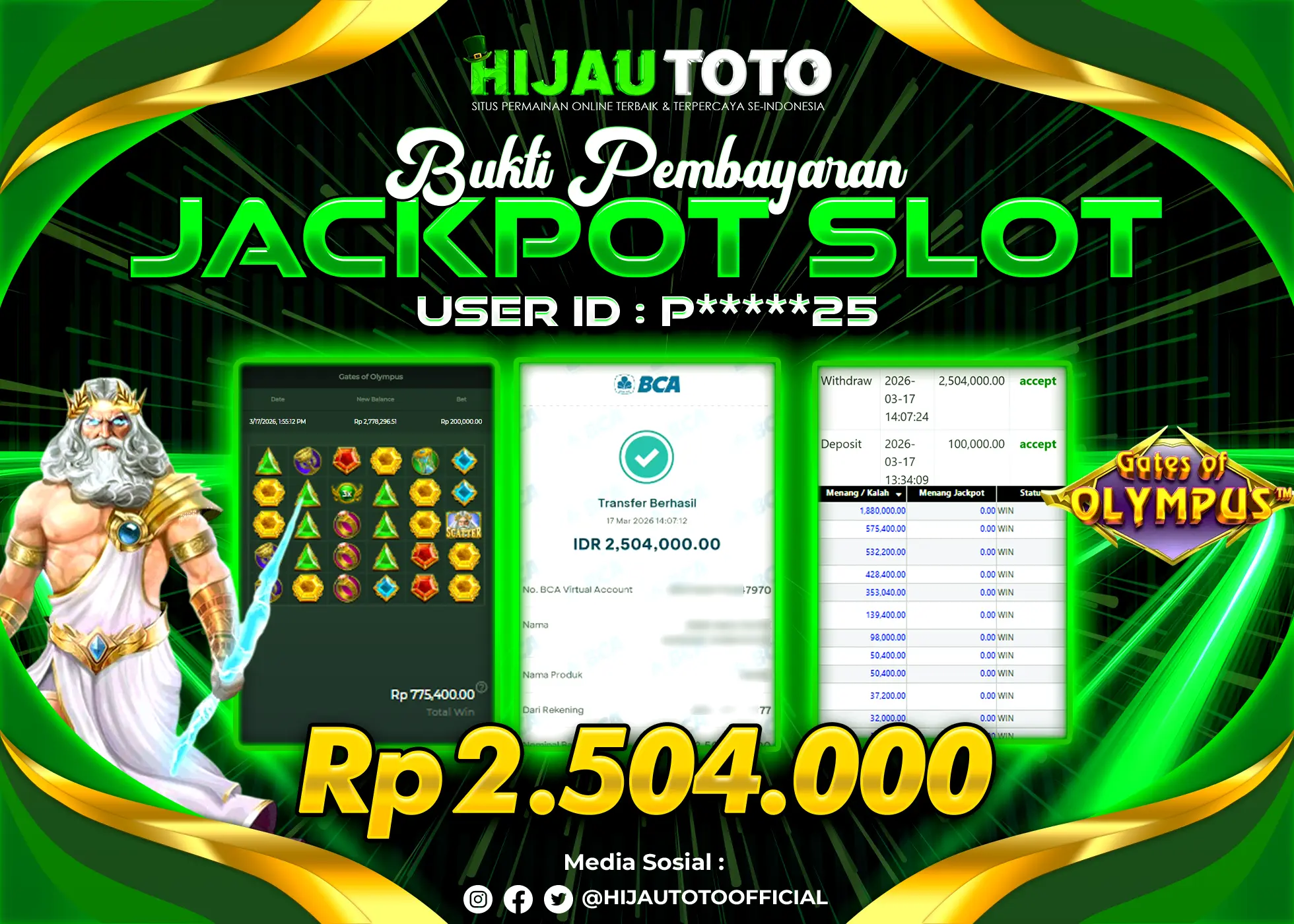 Selamat Kepada Member HIJAUTOTO P*****25 Telah Jackpot Di SLOT GATES OF OLYMPUS