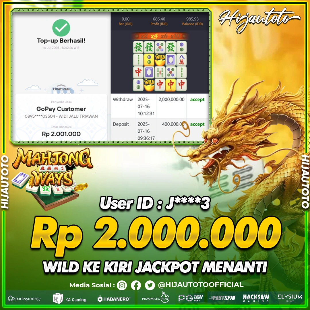 Selamat Kepada Member HIJAUTOTO JU****3 Telah Jackpot Di SLOT MAHJONG WAYS