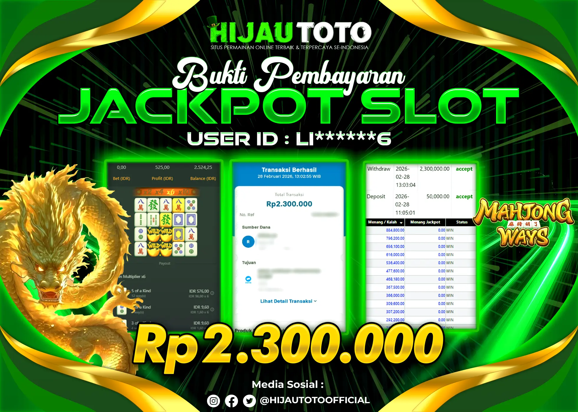 Selamat Kepada Member HIJAUTOTO LI******6 Telah Jackpot Di SLOT MAHJONG WAYS