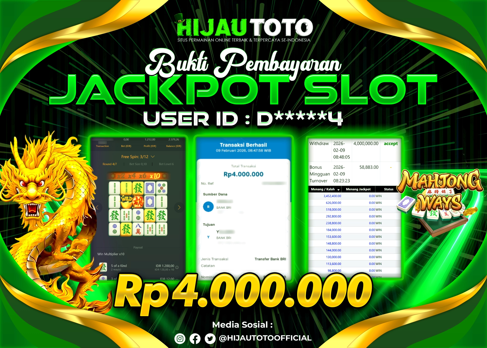 Selamat datang di HIJAUTOTO, tempatnya seru-seruan dan cuan besar! Mulai main cukup dengan modal Rp5.000 aja, taruhan super murah dari Rp100 perak! Mau main slot yang penuh warna? Atau togel dari 20 pasaran paling hits? Atau mungkin tembak ikan yang bikin deg-degan? Tenang, ada juga taruhan bola, sabung ayam, dan live casino yang bikin suasana makin hidup! Daftar sekarang dan dapetin bonus new member 100% langsung, biar modalmu makin tebal. Deposit gampang banget, bisa pakai QRIS, dan kalau butuh bantuan, customer service kita siap 24 jam nonstop. Jadi, tunggu apa lagi? Yuk, gabung dan bawa pulang kemenangannya cuma di HIJAUTOTO!