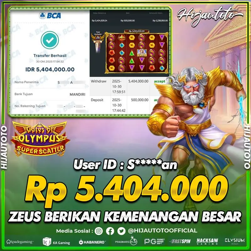 Selamat Kepada Member HIJAUTOTO S*****AN Telah Jackpot Di SLOT GATES OF OLYMPUS SUPER SCATTER