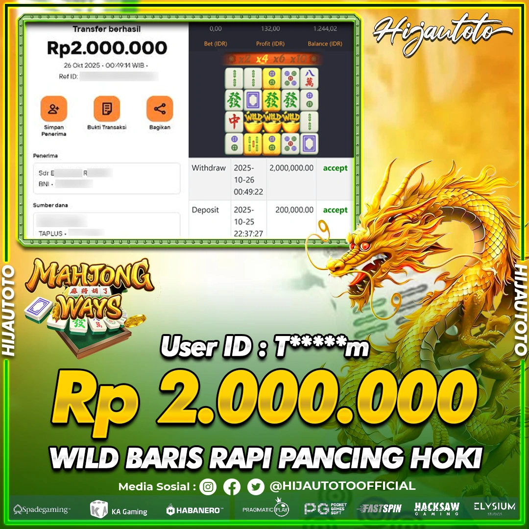 Selamat Kepada Member HIJAUTOTO P****1 Telah Jackpot Di SLOT MAHJONG WAYS