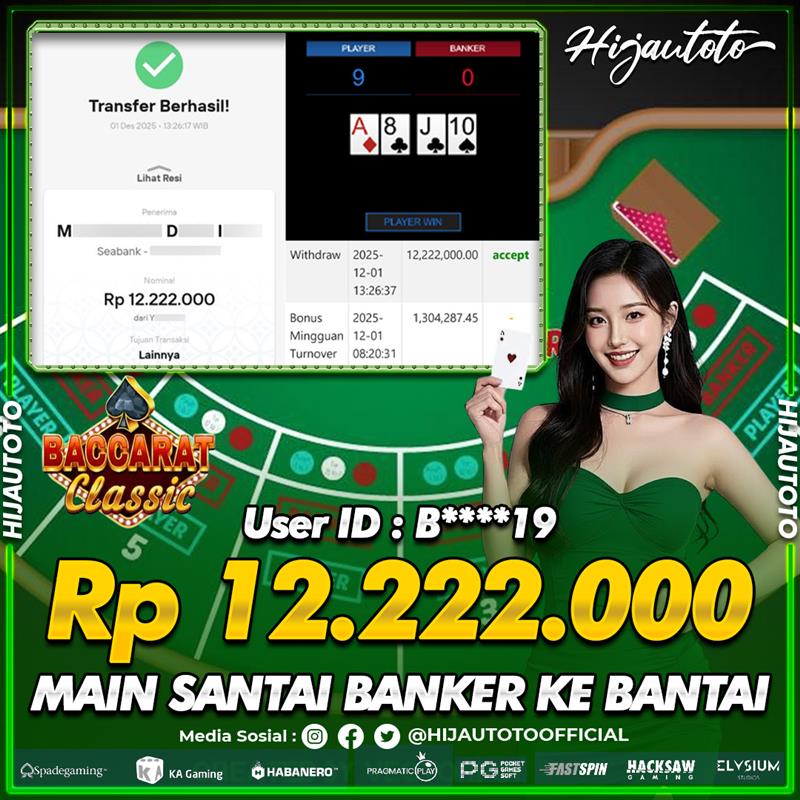 Selamat Kepada Member HIJAUTOTO B*****9 Telah Jackpot Di SLOT BACCARAT CLASSIC