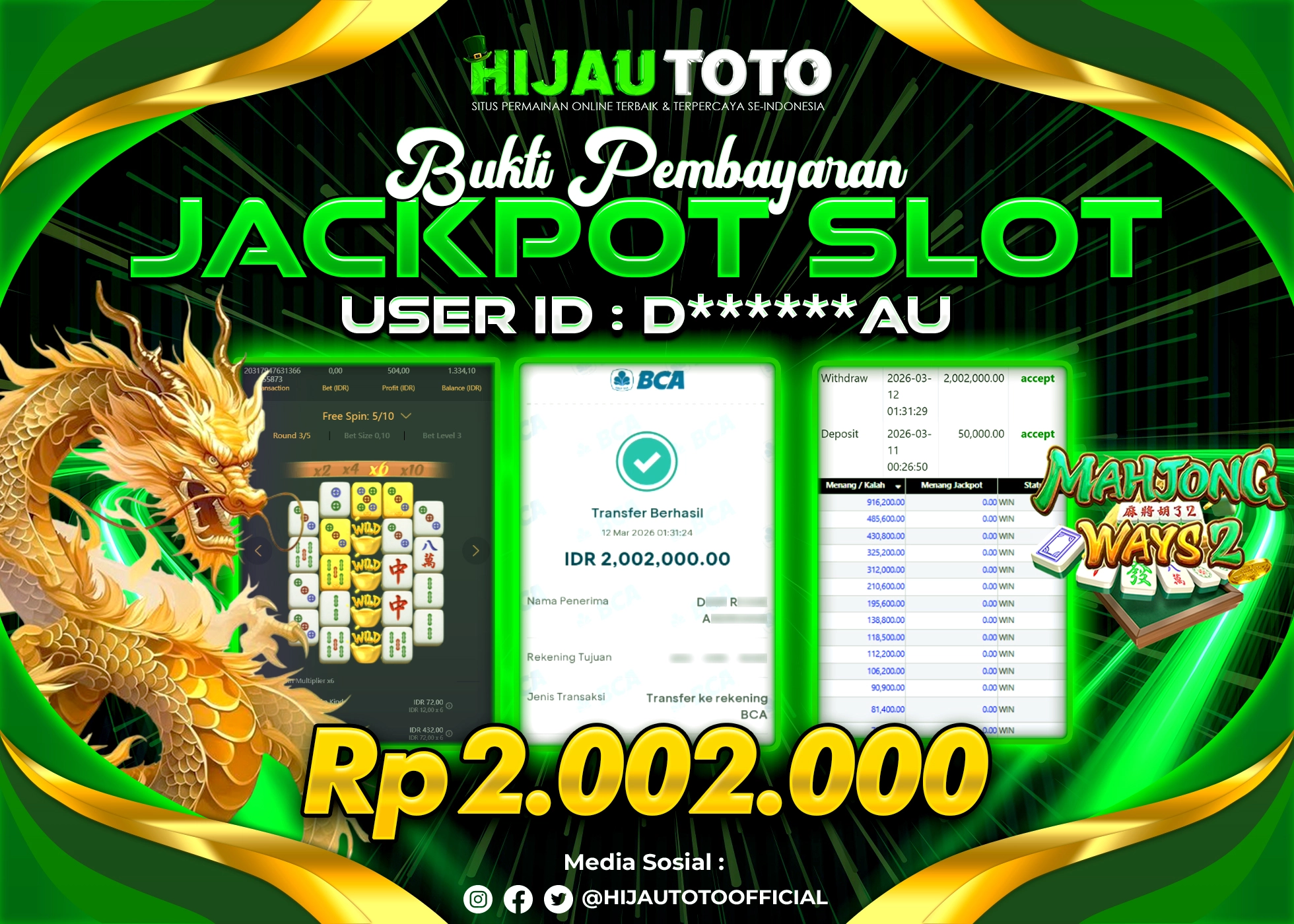 Bergabung dengan HIJAUTOTO sangat mudah dan cepat. Cukup lakukan pendaftaran dengan data lengkap, lakukan deposit minimal Rp5.000 melalui berbagai metode termasuk QRIS, dan mulai bertaruh dengan minimal taruhan Rp100. Dapatkan juga bonus new member 100% untuk modal bermain lebih besar.