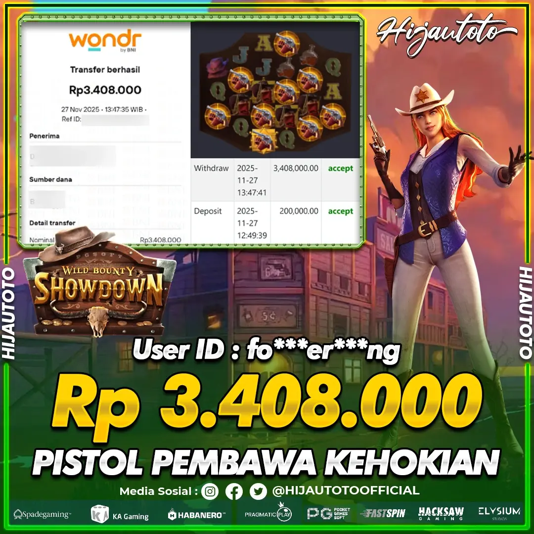 Selamat Kepada Member HIJAUTOTO FO********NG Telah Jackpot Di SLOT WILD BOUNTY SHOWDOWN