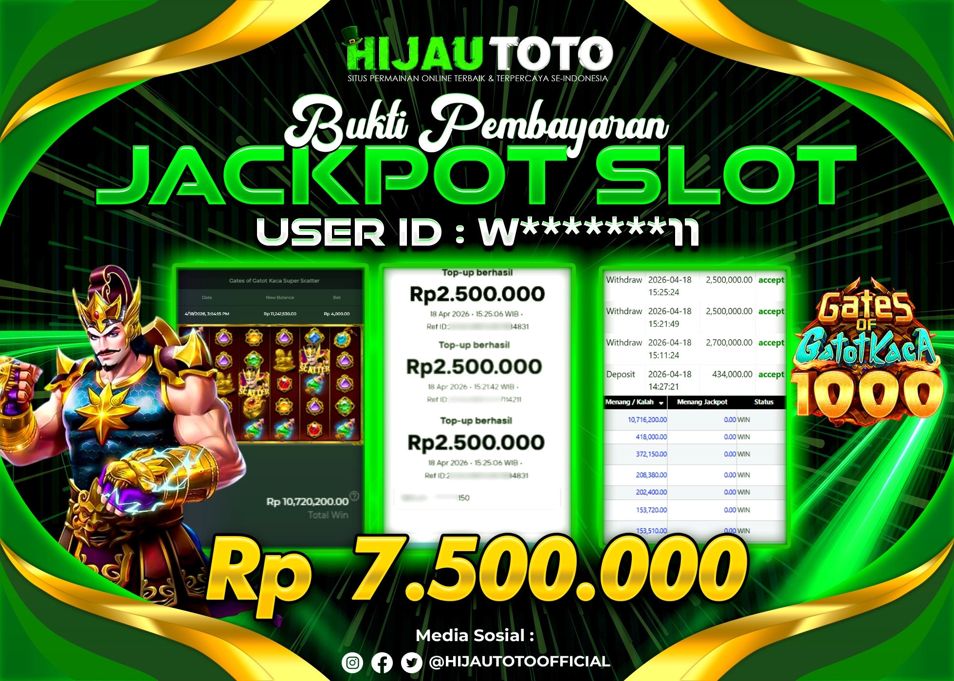 Selamat Kepada Member HIJAUTOTO W********11 Telah Jackpot Di SLOT GATES OF GATOT KACA 1000