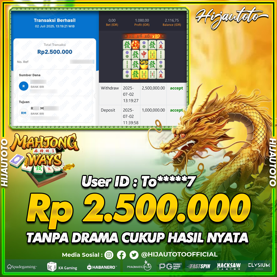Selamat Kepada Member HIJAUTOTO O******34 Telah Jackpot Di SLOT MAHJONG WAYS