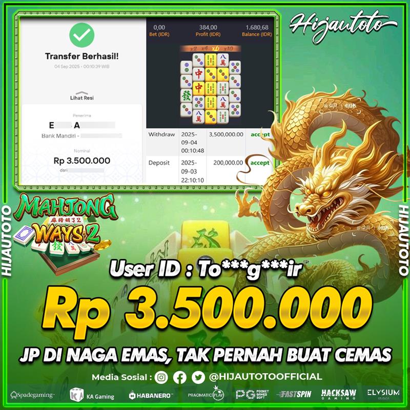 Selamat Kepada Member HIJAUTOTO TO*******IR Telah Jackpot Di SLOT MAHJONG WAYS 2