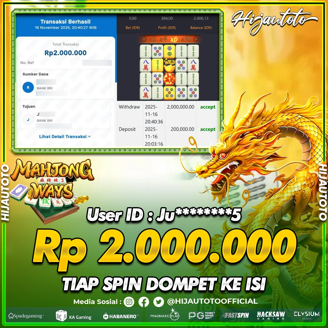 Selamat Kepada Member HIJAUTOTO JU********5 Telah Jackpot Di SLOT MAHJONG WAYS