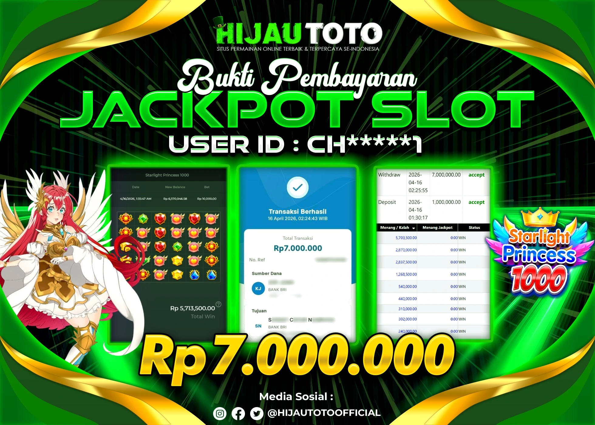 Selamat Kepada Member HIJAUTOTO CH*****1 Telah Jackpot Di SLOT STARLIGHT PRINCESS 1000