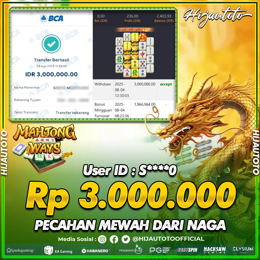 Karena berhasil memenangkan Rp.Rp.2.300.000 dari permainan seru SLOT MAHJONG WAYS di HIJAUTOTO! πŸ’°πŸ’Έ