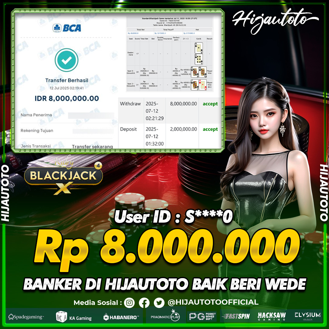 Selamat Kepada Member HIJAUTOTO S****0 Telah Jackpot Di LIVE CASINO RUBY BLACKJACK