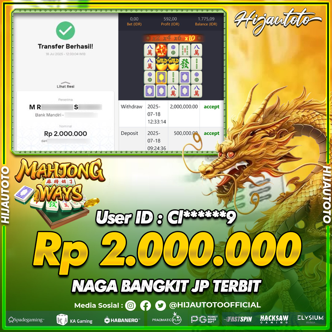Selamat Kepada Member HIJAUTOTO CI******9 Telah Jackpot Di SLOT MAHJONG WAYS