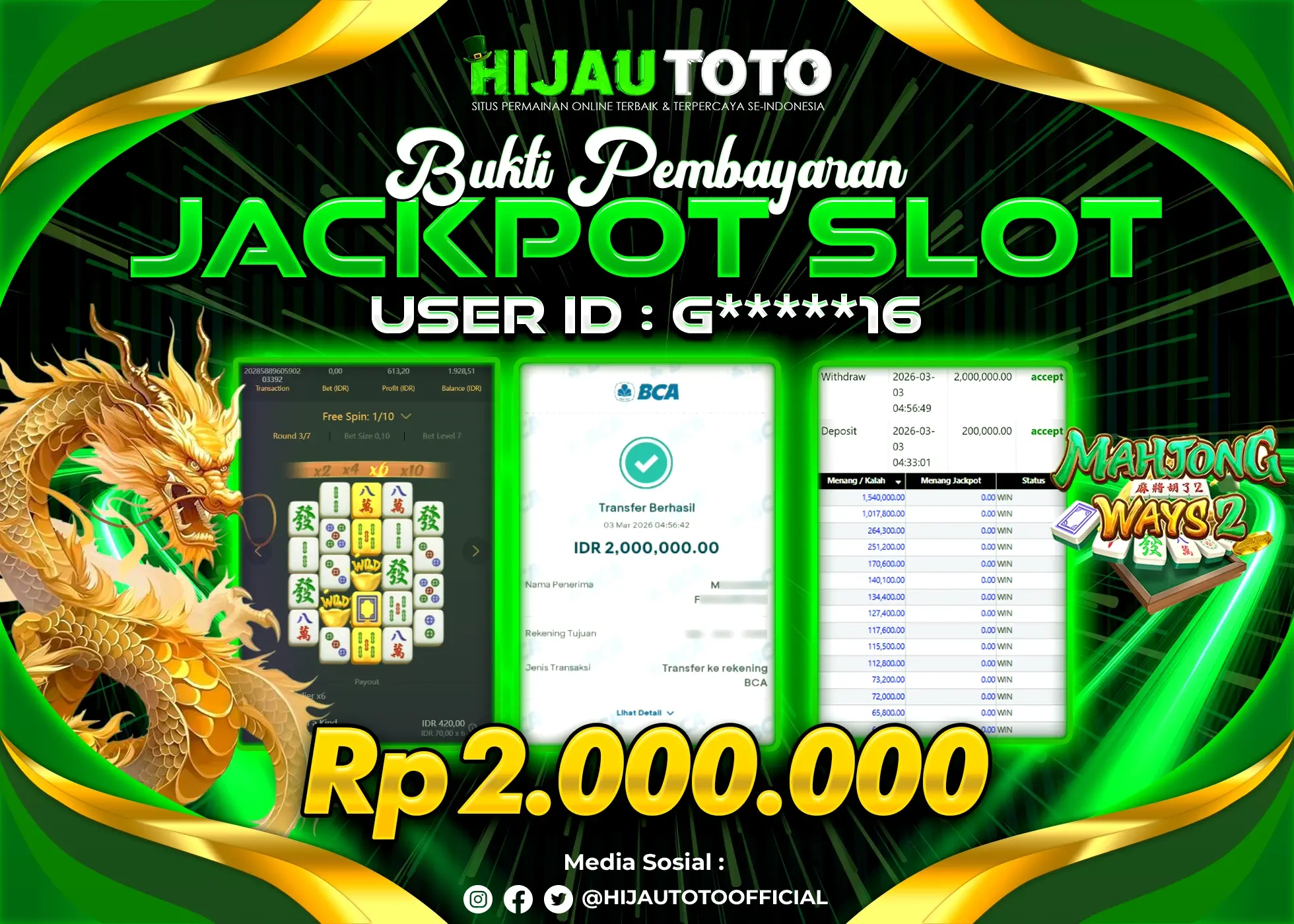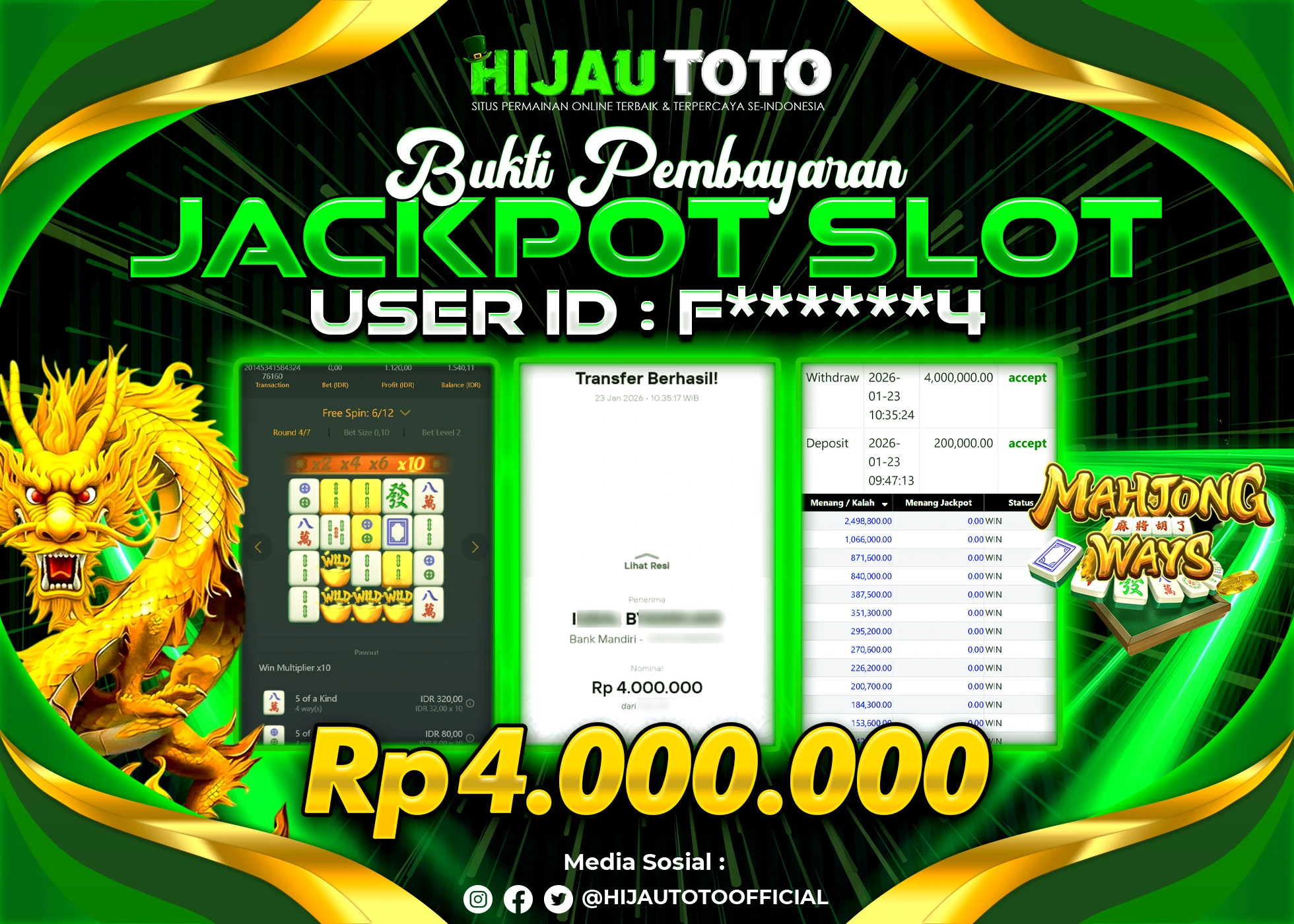 Bergabung dengan HIJAUTOTO sangat mudah dan cepat. Cukup lakukan pendaftaran dengan data lengkap, lakukan deposit minimal Rp5.000 melalui berbagai metode termasuk QRIS, dan mulai bertaruh dengan minimal taruhan Rp100. Dapatkan juga bonus new member 100% untuk modal bermain lebih besar.