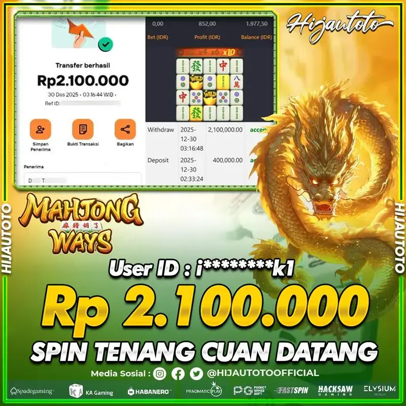 Selamat Kepada Member HIJAUTOTO I********K1 Telah Jackpot Di SLOT MAHJONG WAYS